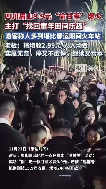 谁小时候没干过!攥着半截甘蔗跑,鞋跟都被邻居王大爷的扫帚勾掉,甜汁儿黏手腕上能舔一下午! 眉山这9.9元合法偷甘蔗火疯了!游客挤得甘蔗叶蹭肩膀,比春运火车站还热闹,有人连没熟的小甘蔗都拔走! 老板说昨天刚浇的地,下午就成光杆儿地,连界标的甘蔗苗都没剩,9.9元根本不够赔苗钱! 倒不是想赚,停了对不起天天来问的游客,继续做又得贴钱买苗,加2.99元入场费,实属给情怀留口饭吃! 小时候偷甘蔗是邻居包容,现在合法偷是老板善意,但善意也得吃饱饭啊! 你们小时候偷过桃/李/黄瓜吗?觉得这2.99元加得合理不?要是你是老板,会咋守住这份童年乐子?