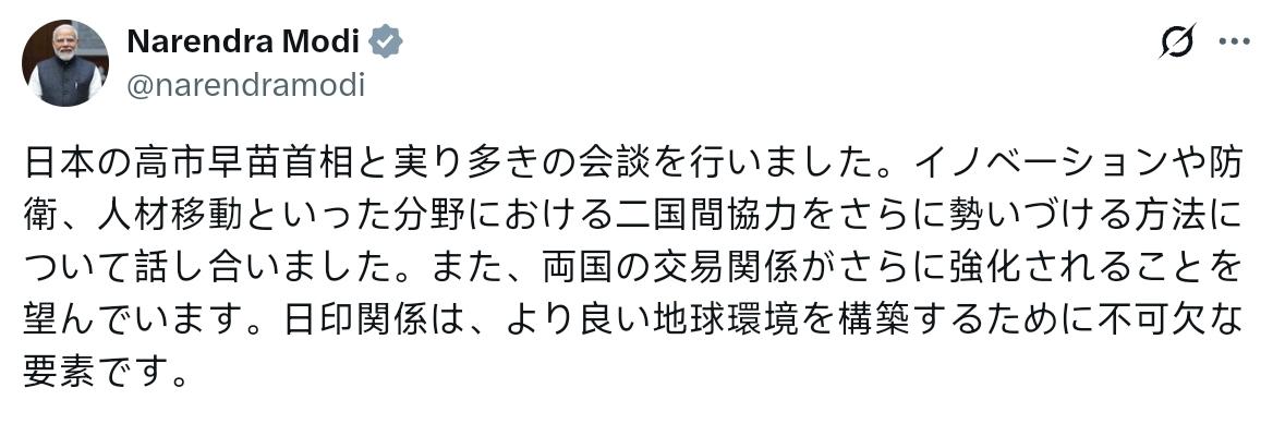 莫迪:我与日本首相高市早苗举行了富有成效的会晤。我们探讨了如何进一步加强在创新、国防和人才流动等领域的双边合作。我也希望进一步巩固我们的贸易关系。日印关系是构建更美好全球环境的重要组成部分。