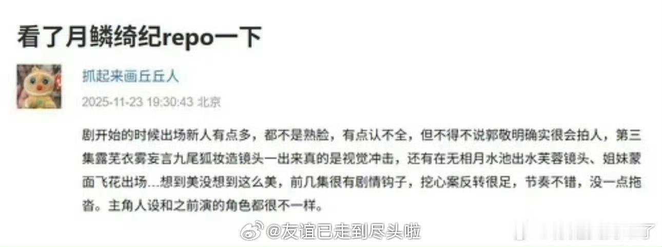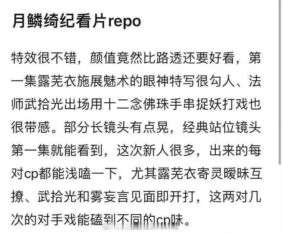 鞠婧祎曾舜晞陈都灵田嘉瑞《月鳞绮纪》看片repo:中式志怪风,特效好,颜值盛宴,几对cp各有各的磕点,有剧情。感觉会比《大梦归离》播得好