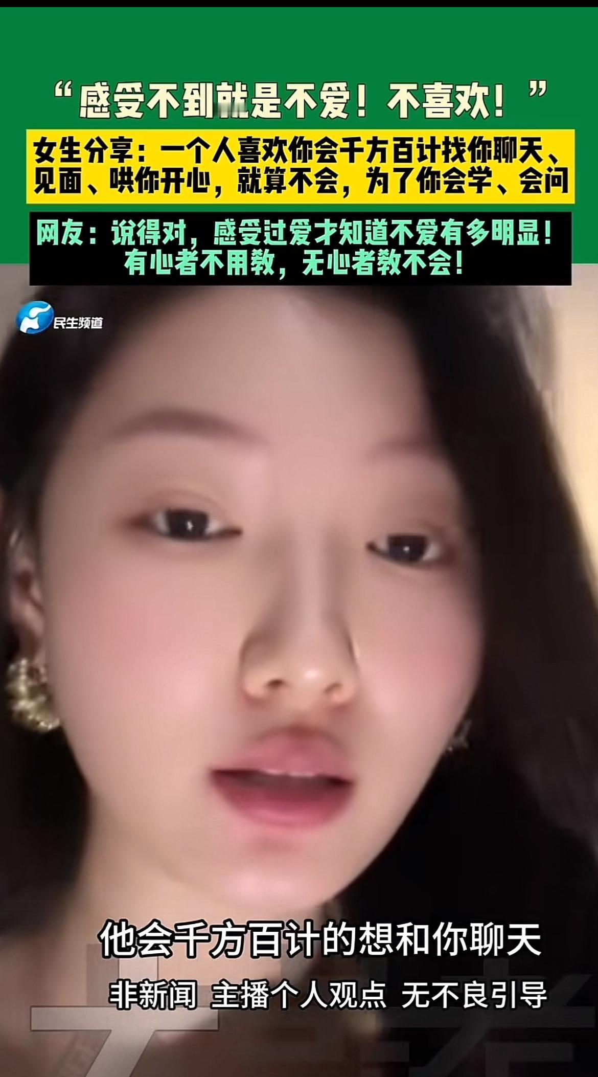 女生恋爱,真得明白感受不到的爱就是不爱。现在好多人谈恋爱,刚在一起时一天发200条消息,甜蜜得不行。可新鲜感一没,态度就变了,不撒娇、不秒回,约会都穿拖鞋。有人就慌了,怀疑是不是不爱了。 其实,爱不是只靠感觉,更是选择。真正的爱,是哪怕没了新鲜感,也会记得对方胃不好不能吃辣,下雨天提前放好伞,加班时默默热好饭。但如果一直只有自己主动付出,爱意失衡,那这份爱就只是执念。相爱才有用,感受不到回应的爱,就别再傻傻坚持啦。