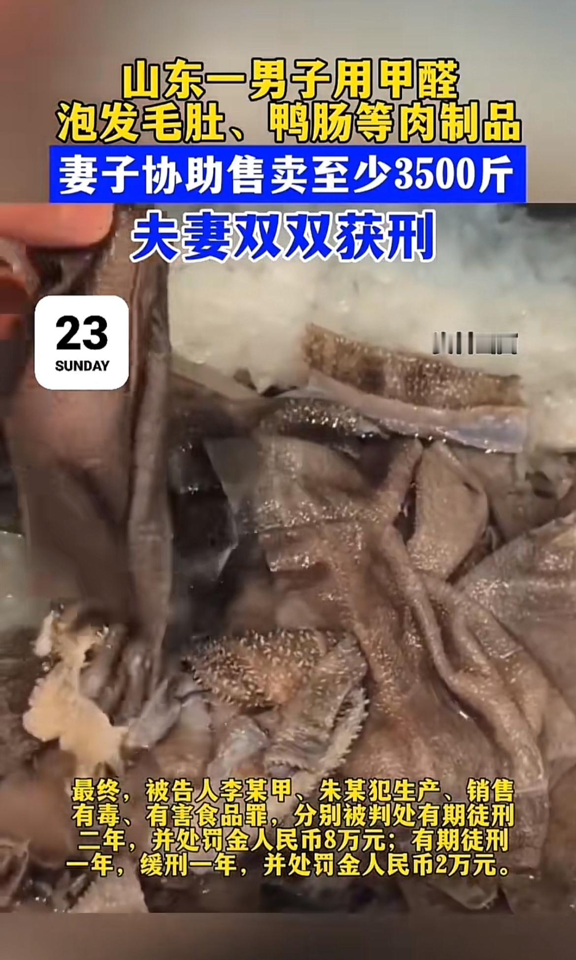 这对夫妻真的太过分了!山东省东营市的李某甲和朱某,自2020年起经营肉制品生意,半年后竟开始用甲醛泡制食品。夏天时,他们把品相不好的牛百叶、毛肚等用甲醛泡,就为让产品好看且不易变质。 他们至少销售了3500斤含甲醛的肉制品。经检测,侦查机关扣押的冷库和室内存放的多种肉制品都含甲醛。最终,李某甲被判有期徒刑二年,罚金8万;朱某被判有期徒刑一年,缓刑一年,罚金2万。为了利益伤害消费者健康,获刑真是咎由自取!
