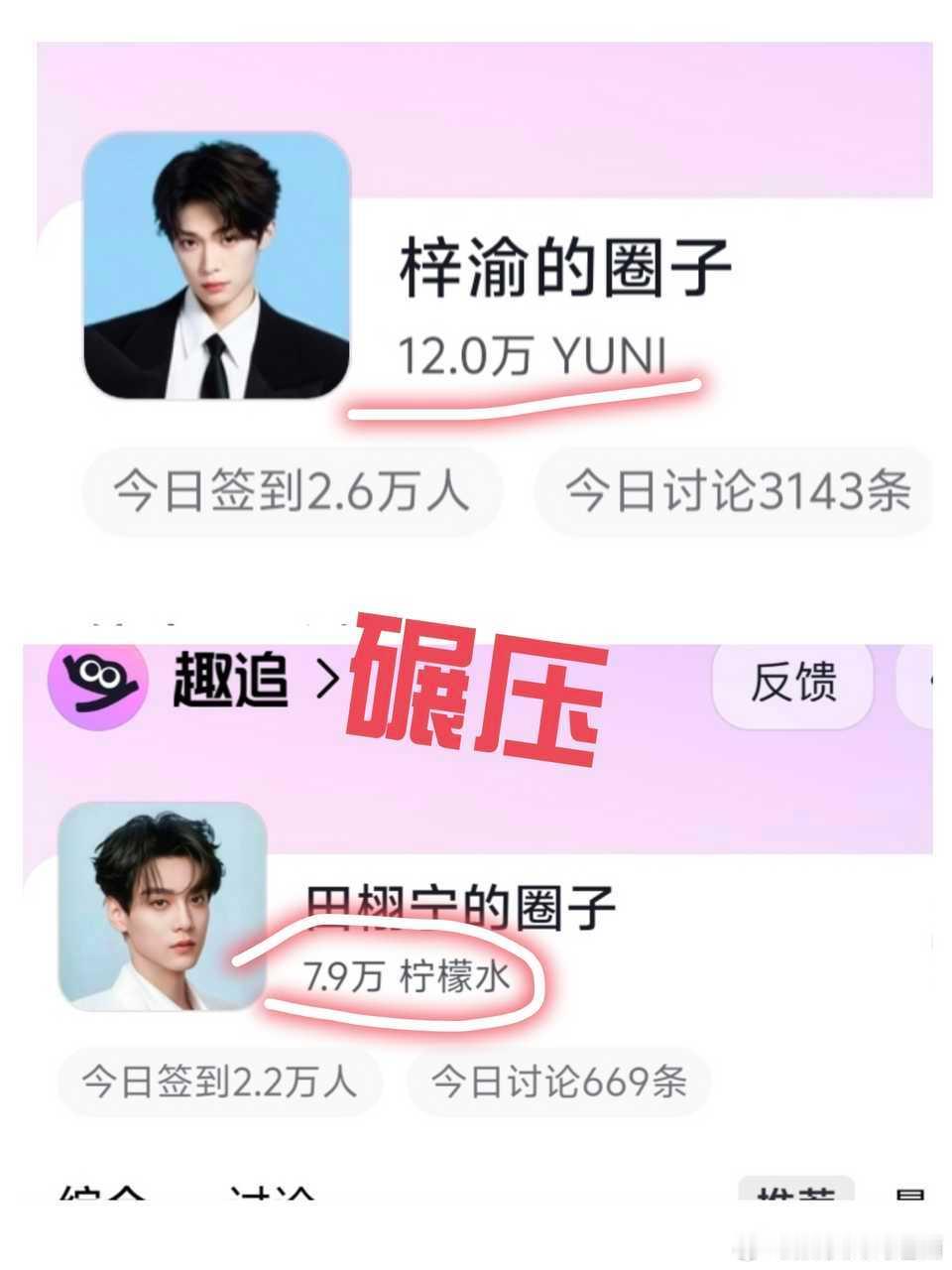 梓渝🆚田栩宁 近期🌲据盘点:贴吧:🔮3.9万VS⚡2.4万煮娱:🔮5969VS⚡3680红薯热力值:🔮85.5VS⚡76.8BD影响力:🔮1.61万VS⚡5326vx指数:🔮16098607VS⚡9351888抖圈子:🔮12万VS⚡7.9万