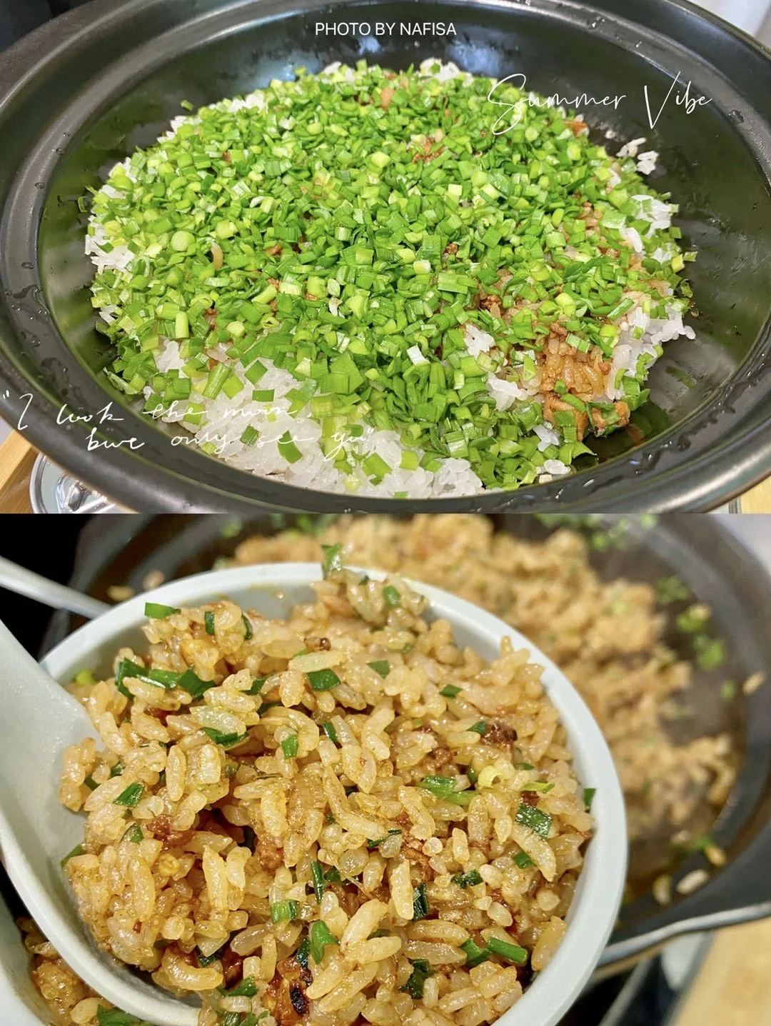 主食「老海南韭菜虾仔焗饭」端上桌现炒,韭菜碎、葱花、虾米混合在一起,一锅可以盛满满的3碗