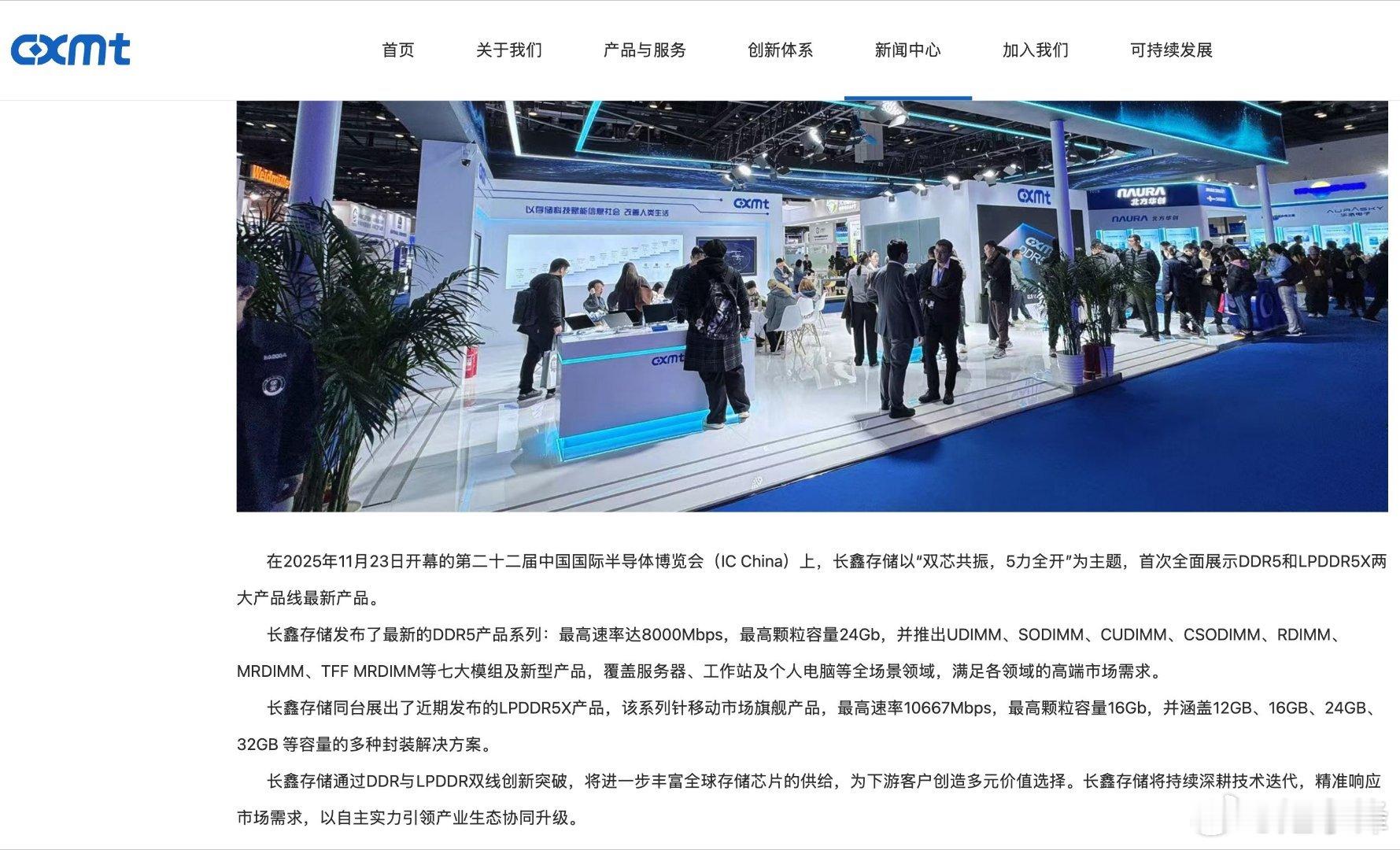 在11月23日开幕的第二十二届中国国际半导体博览会(IC China)上,长鑫存储发布了最新的DDR5产品系列:最高速率达8000Mbps,最高颗粒容量24Gb,并推出UDIMM、SODIMM、CUDIMM、CSODIMM、RDIMM、MRDIMM、TFF MRDIMM等七大模组及新型产品,覆盖服务器、工作站及个人电脑等全场景领域。