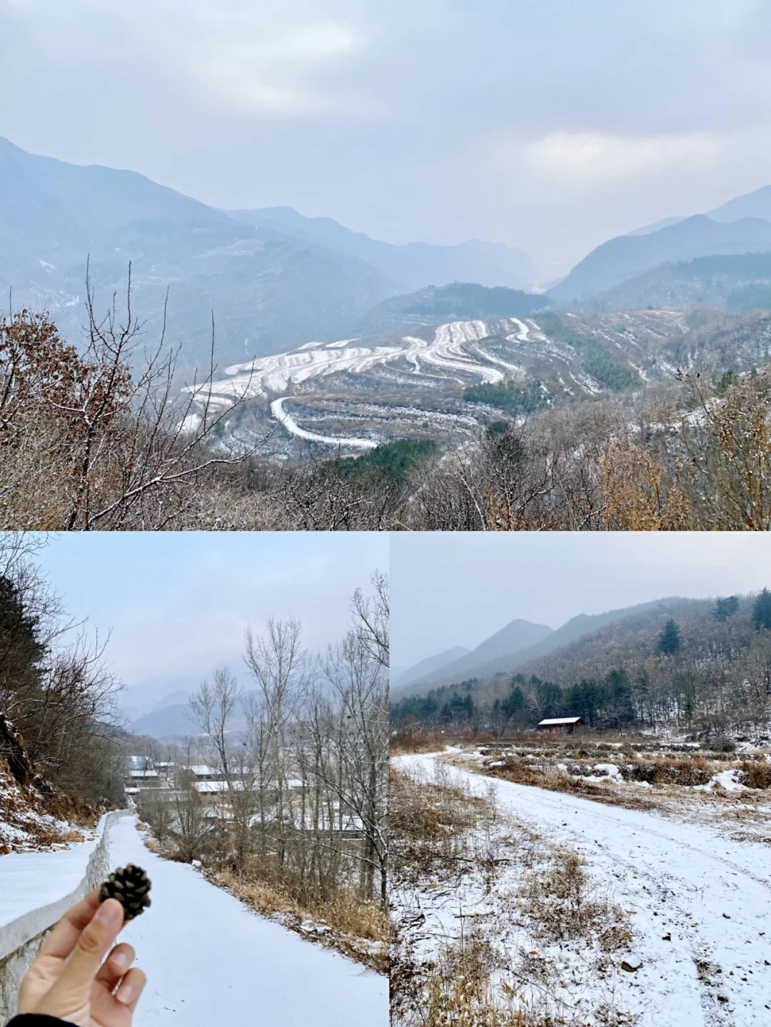 吃过早餐后,可以沿着后山走走,雪中森林徒步,这是在城市里没有的体验,山路比较缓,边走边看,呼吸着新鲜空气,沉浸在山间景色当中,走到半山腰的一处平台,还可以眺望梯田,沿途透过枝桠缝隙,还能看到对面民宿的全景~