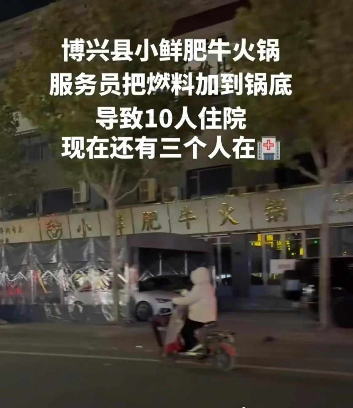 火锅店误将燃料加入汤锅致11人入院,官方:已成立联合调查组处置 22日,有网友发视频称,山东博兴县小鲜肥牛火锅,服务员把燃料加到锅底,导致10人住院,现在还有3个人在医院。"燃料和锅底的壶是一样的""我们加错过"。目前只有1人因为是外地的,在博兴没人照顾,还在医院输液观察,其他都已出院回家。