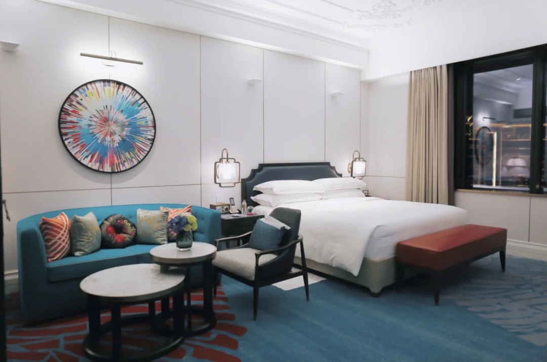🌟亮点特色:60多平米的豪华客房以白色和蓝色为主基调,中式的实木家具和西式的色彩搭配,在展现中西文化交融和谐之美的同时,也体现酒店中西合璧的优雅美学。1.8米的大床宽敞舒适,让我一觉睡到天亮,不想起床。