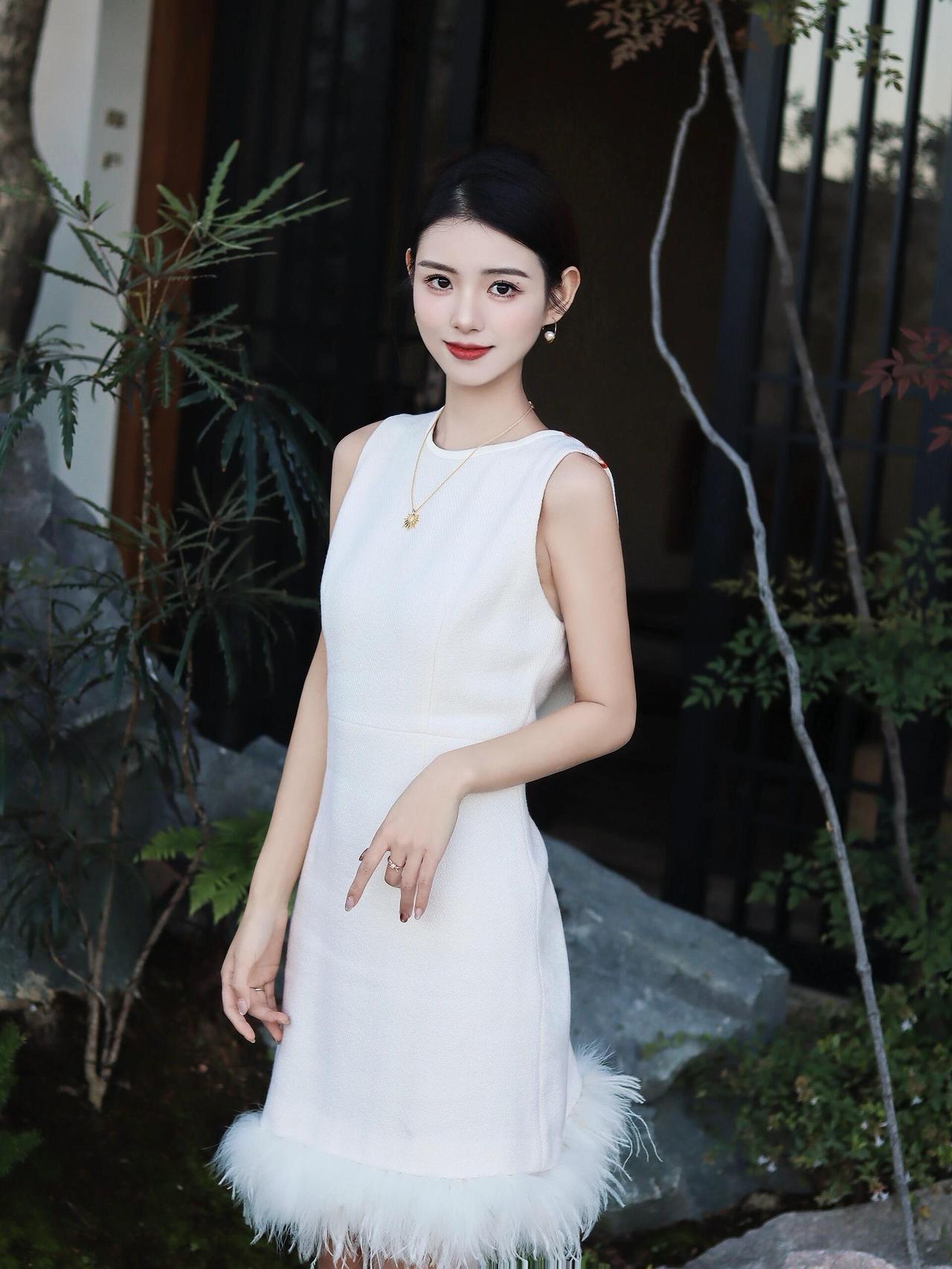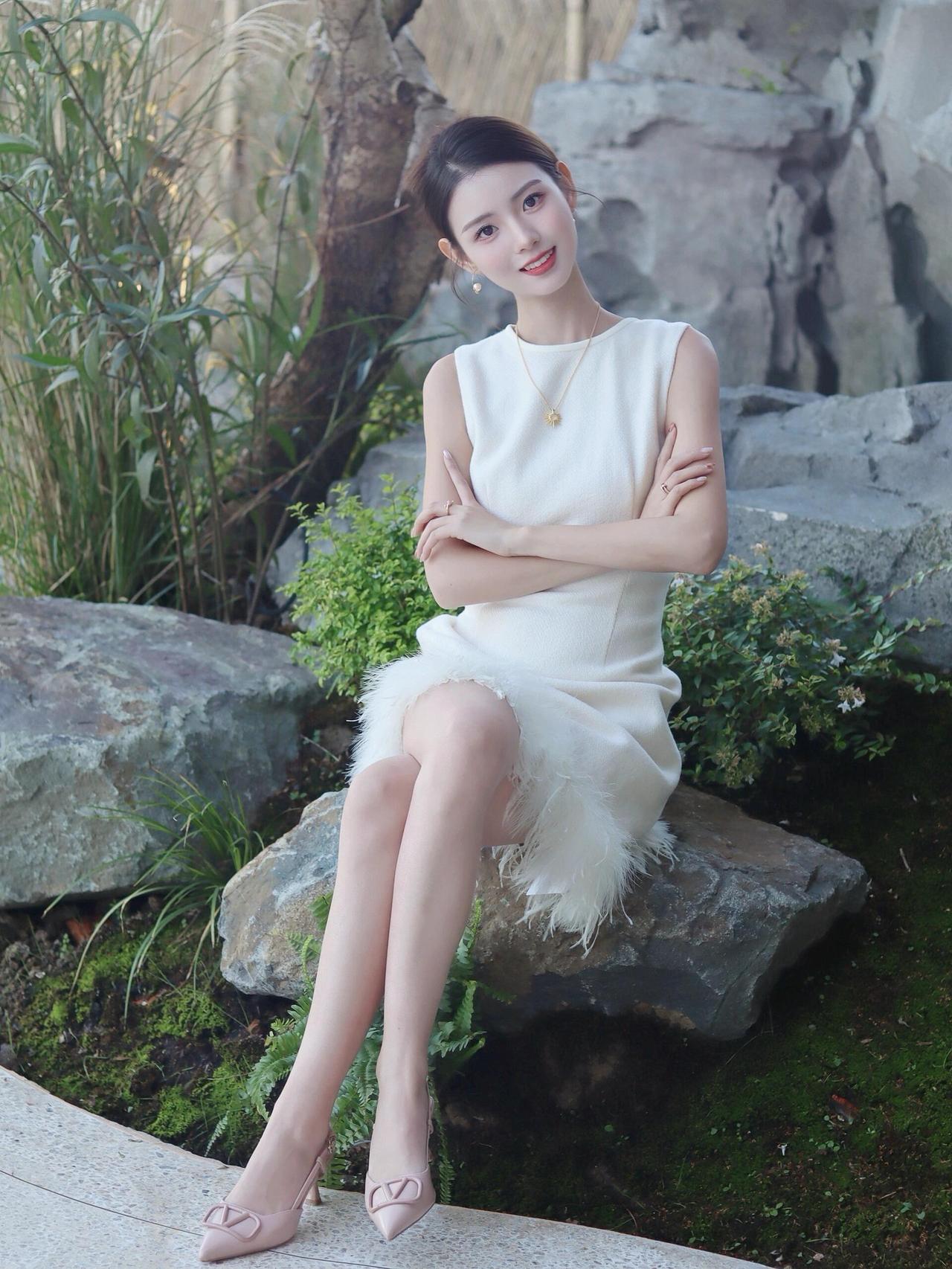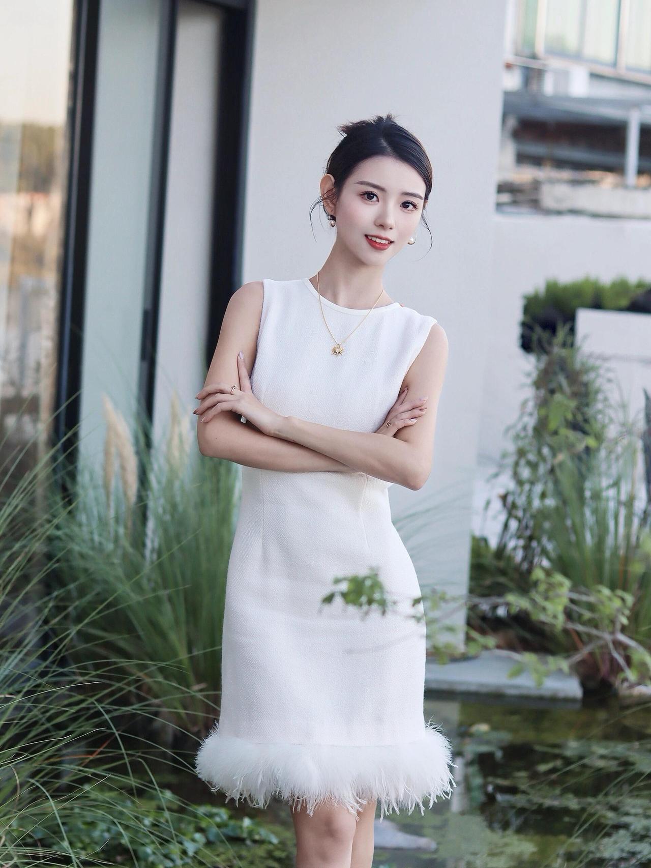 这套穿搭把“温柔精致”焊在身上啦~ 无袖米白连衣裙自带优雅氛围,裙摆的羽毛边像裹了层软乎乎的云朵,甜而不腻;搭配细链小金饰,太阳花吊坠轻轻落在锁骨间,是低调又抓眼的精致感~