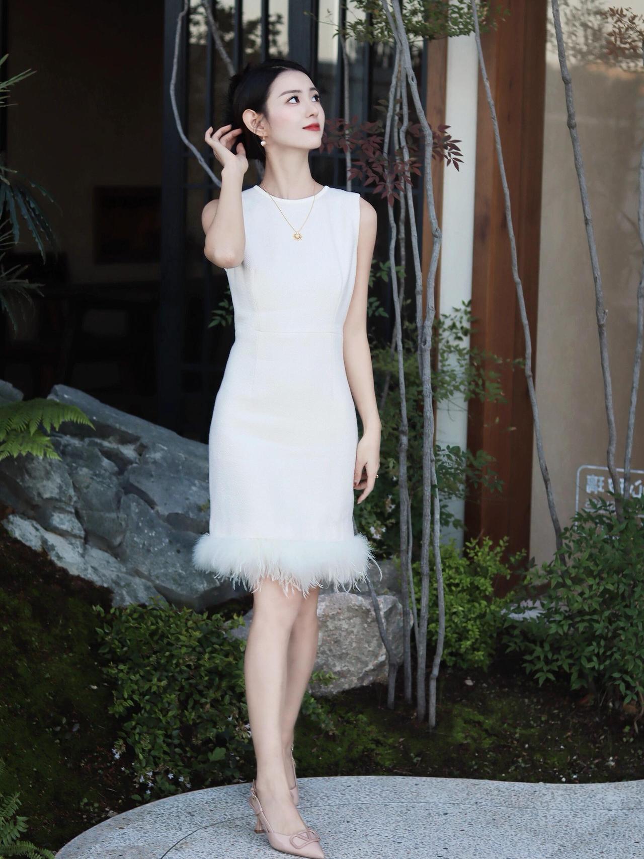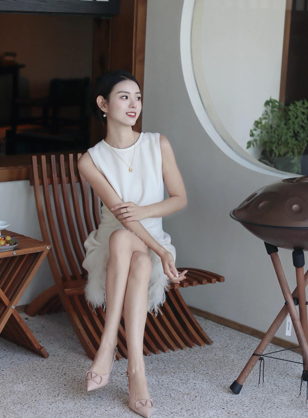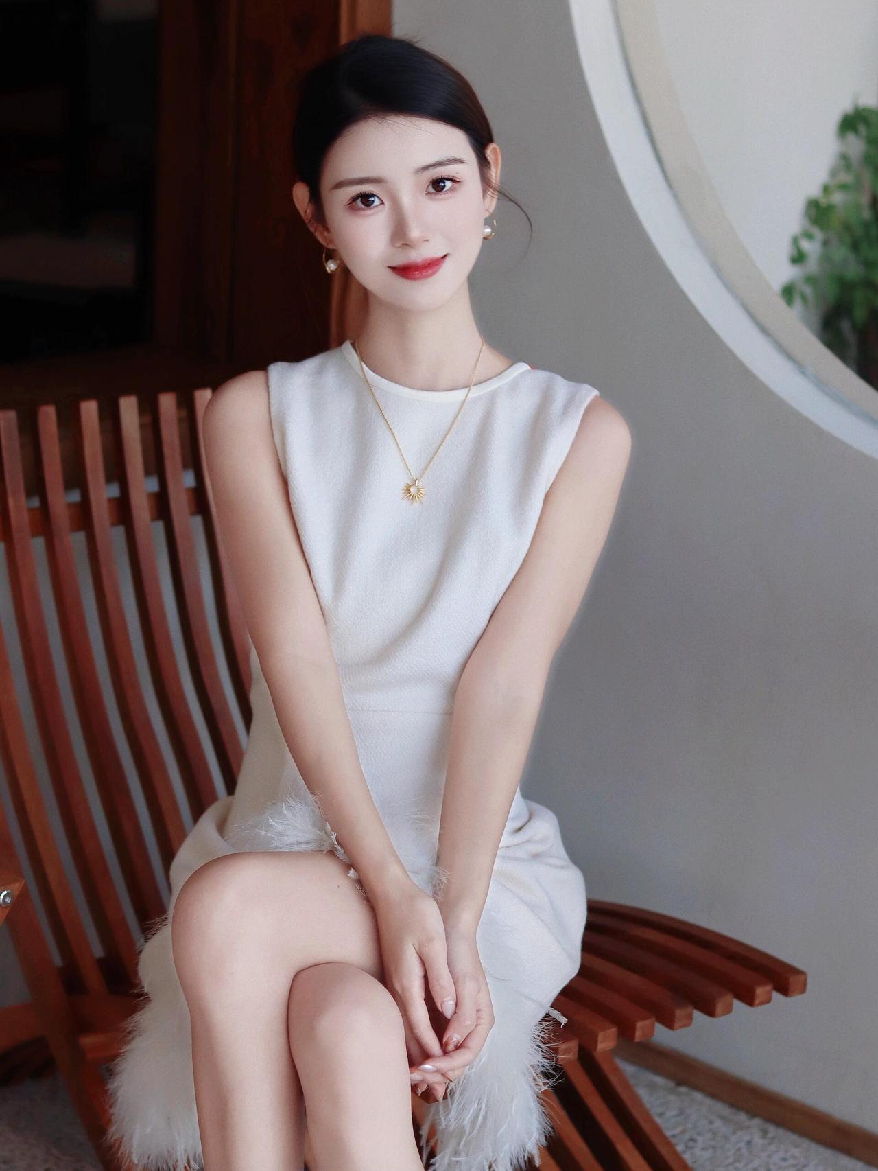 这套穿搭把“温柔精致”焊在身上啦~ 无袖米白连衣裙自带优雅氛围,裙摆的羽毛边像裹了层软乎乎的云朵,甜而不腻;搭配细链小金饰,太阳花吊坠轻轻落在锁骨间,是低调又抓眼的精致感~
