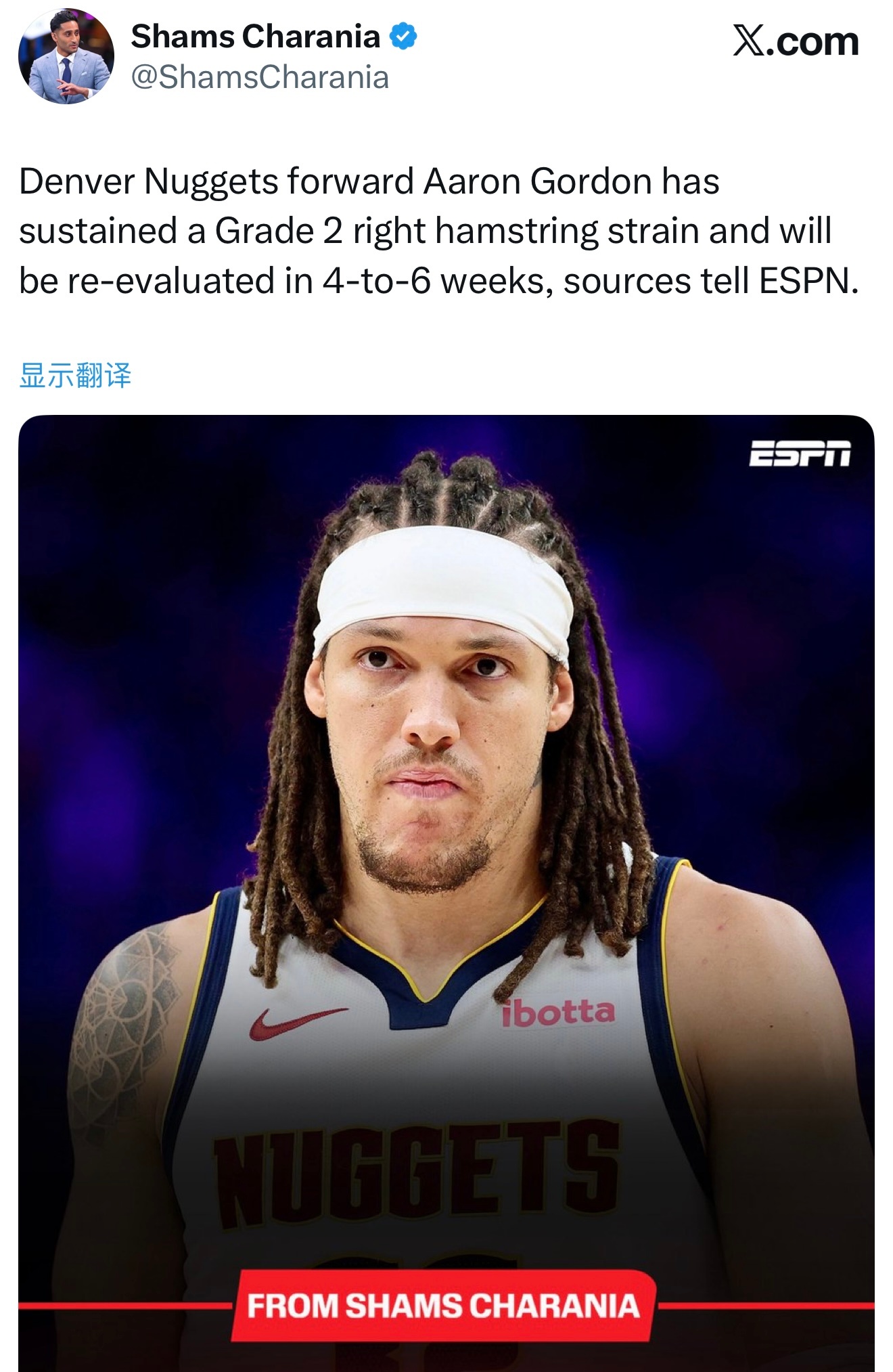 Shams:阿隆·戈登右腿筋二级拉伤,4-6周后接受重新评估。