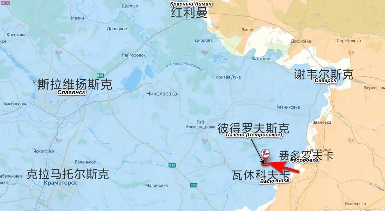 俄军南部集群在谢韦尔斯克以南的另一条战线上加大了活动力度,从瓦休科夫卡或费多罗夫卡方向发起进攻,占领了巴赫穆特区彼得罗夫斯克(乌克兰在2016年改名为帕济诺)。 这可能是俄军开辟另一条通往斯拉维扬斯克的通道。目前,俄军西部集群正从北部突破红利曼的乌军防线,向斯拉维扬斯克攻击前进。