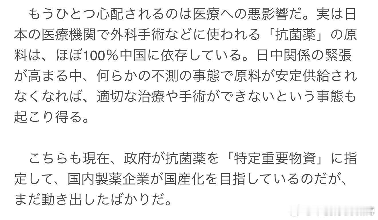 日本医疗外科手术使用的抗菌药的原料100%都依赖中国进口。