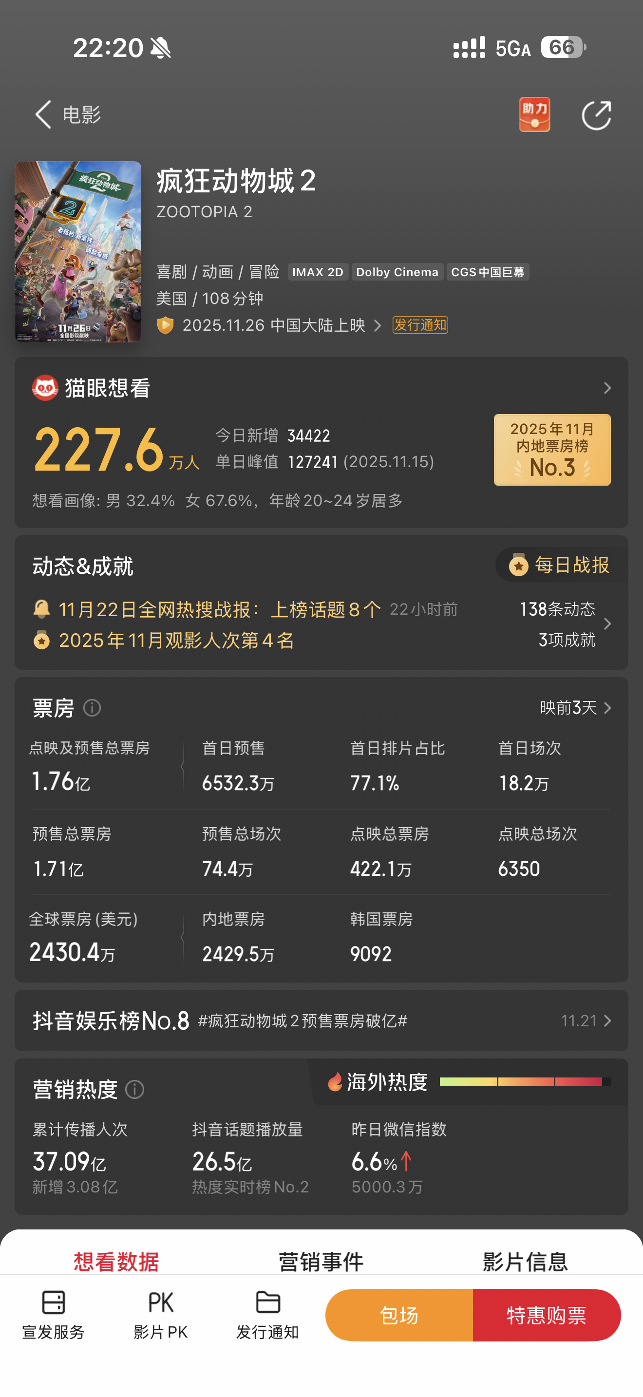 传奇神作 目前预售已经高达1.7亿,以目前预计首日票房就破2.56亿。 距离电影正式上映还有三天。 这次罕见的没有把新片放在周五。 随便选了一下我北京的家对面的万达CBD影院来说。 周三凌晨场次都卖出一半的票。 再看一下三里屯英皇也是黄金区域全部扫射。 这可是2025年的11月。 以当下的电影市场和当下的经济消费来说。 一个周三的零点场。 都能有如此的上座率。 虽然是全国最发达的城市观影的氛围不容小觑。感觉这次 的总票房会突破非常显著的纪录。在当下的经济形势下,大家太需要一部这样的热血电影带来快乐。 大家买一张票给狐狸兔子交了份子钱。110分钟沉浸在“真实存在的动物城” 里 忘记现实世界的烦恼。和新朋友盖瑞一起冒险打破种族歧视直面人性黑暗。 蛮值的。 我的粉丝说他看第一部的时候才9岁。 如今第二部刚刚18岁。 这是多么咯噔的文字啊。 作为已经看过电影的博主身份, 已经迫不及待等正式上映二刷三刷了。 比较愚蠢的是。 这么大的顶级IP。 作为全北京唯一一家拥有IMAX GT银幕的电影博物馆。 26号早上9点30的场次竟然没有排给《疯狂动物城2 》 最早一场竟然是下午。 9:30的《鬼灭之刃》就卖了四张票。你们 这么不会赚钱吗? 有木有可能有很多行业从业者大家远在他乡。远在香港上海。远在其他小城镇。 我微信上有800个行业从业者都来问我,你能不能发一条微博骂一下他们? 为什么9:30 不排给动物城 。为什么这么一部跟《奥本海默》《沙丘》体量的传奇又能卖座的电影不优先。 而是给无人在意的《鬼灭之刃》 ? 这片都上映多久了喜欢的影迷早就看完了。 《 动物城2 》 麻烦加场! 好多行业从业者 编剧 制片 大家都准备飞回北京去一趟 看最早场动物城! 麻烦跟《哪吒2 》一样。每天一号厅只放动物城。 立刻协调! 动物城这种电影要连着五刷IMAX2D。 普通厅根本不用看!