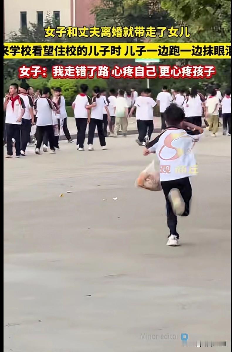 离婚带走女儿,看儿子时他边跑边抹泪:最疼的是孩子替大人扛了苦 这视频看得我鼻子一酸——离婚后妈妈只带走了女儿,去学校看住校的儿子时,那小男孩攥着东西,一边往妈妈这儿跑,一边偷偷抹眼泪。 妈妈说“我走错了路,心疼自己更心疼孩子”,这话戳心窝子啊。大人的选择,最后要孩子用委屈来扛:明明想扑进妈妈怀里哭,却怕妈妈难过,只能偷偷擦眼泪;明明想每天都有妈妈陪,却只能在学校等着偶尔的探望。 离婚从不是“大人的事”,孩子的世界里,爸妈分开就是“一半的家没了”。那些没说出口的想念、藏起来的眼泪,都是他们偷偷消化的委屈。 当爸妈的啊,就算过不下去了,也别让孩子觉得“自己是被丢下的那个”。