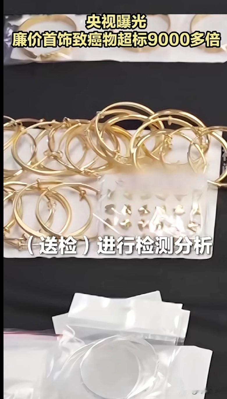 央视曝廉价首饰致癌物超9000倍:别再贪“好看又便宜”了! 这事儿看完后背发凉——央视刚曝的,那些几块、十几块的镀金首饰,致癌物居然超标9000多倍! 就是你在夜市、直播间常刷到的“镀金手镯”“网红项链”,看着金灿灿挺好看,实则是拿有毒金属堆出来的。 皮肤接触久了,这些致癌物能渗进身体,长期戴真可能把“小装饰”变成“健康雷”。 咱别再图那点便宜了!尤其是给孩子买的小发饰、给老人戴的首饰,宁可买贵点的正经材质,也别让“廉价好看”坑了身体。 毕竟再好看的首饰,也不如平平安安值钱。