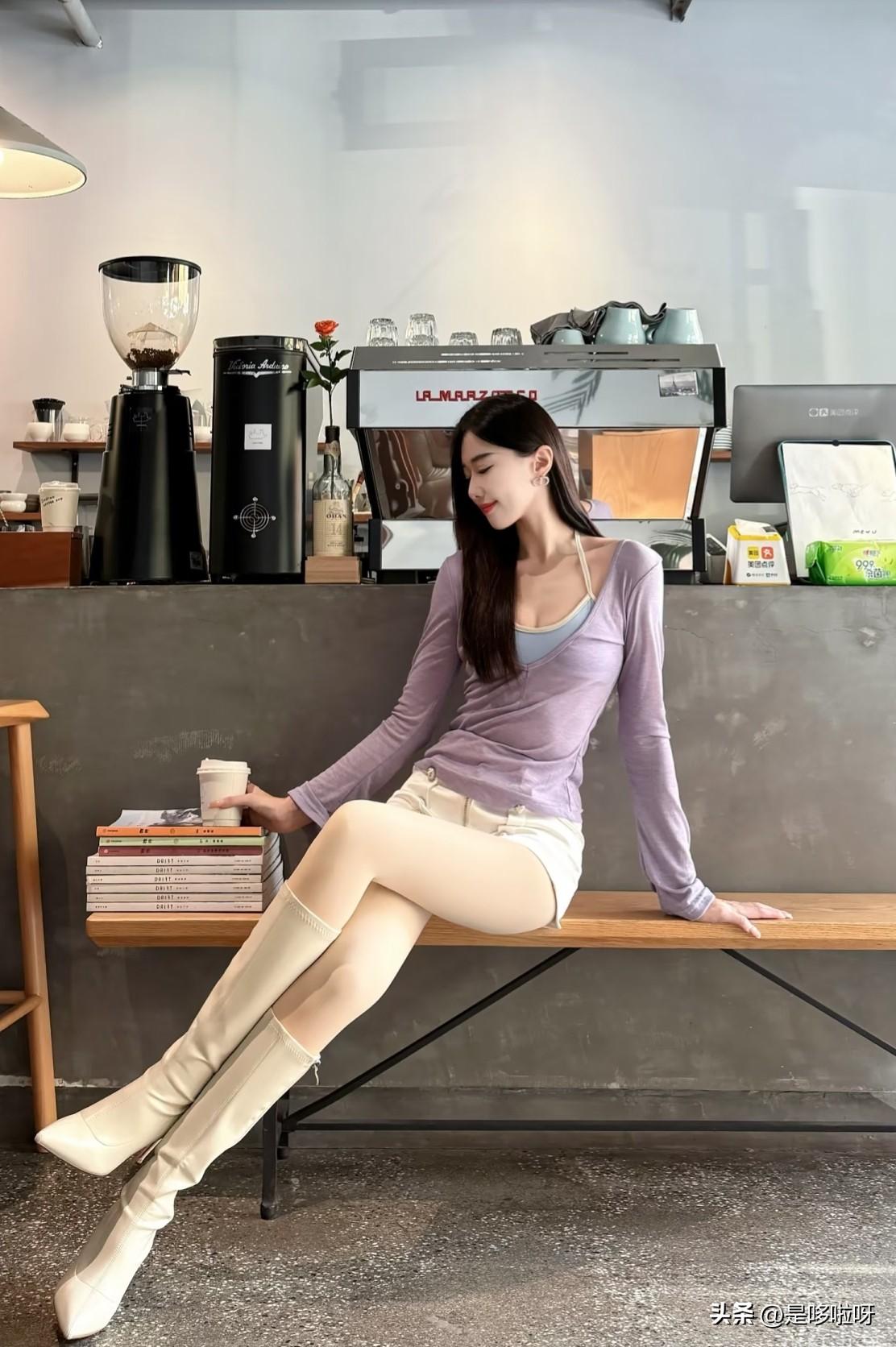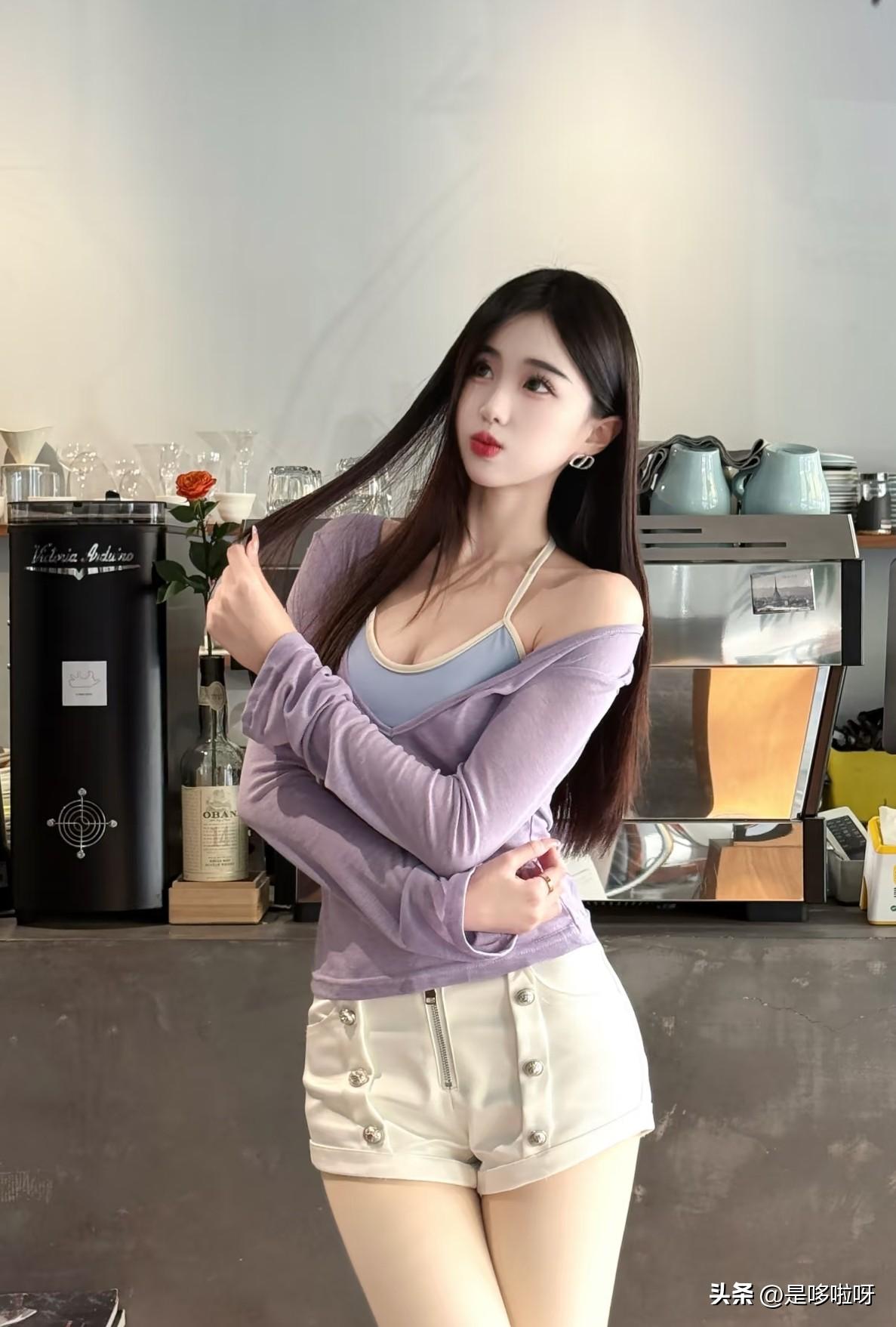 软糯紫色上衣衬得肤色透亮,搭配高腰白短裤,秒get三七分身材
