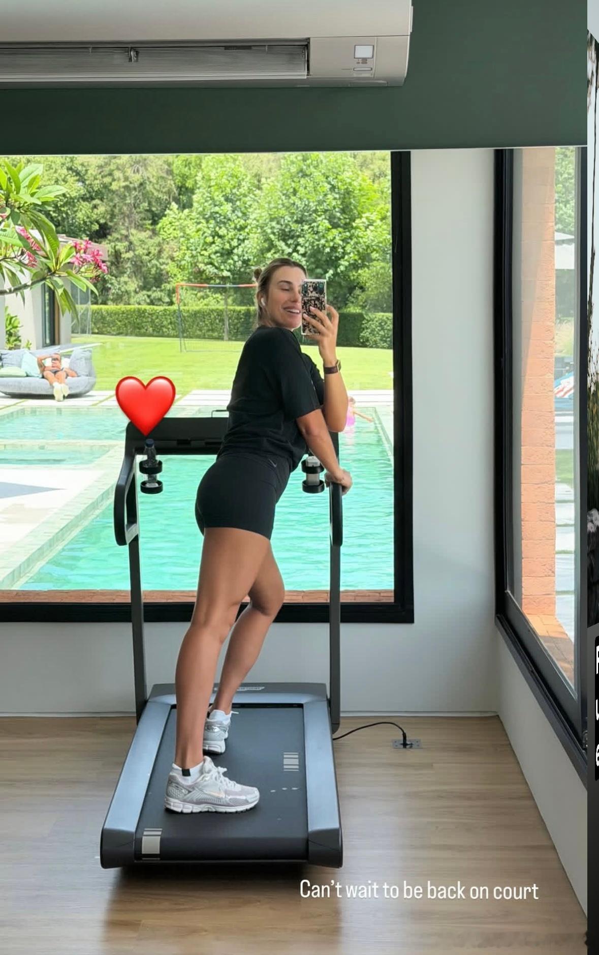萨巴伦卡!准备回到球场恢复网球训练了!Aryna发了两个快拍,自己穿着“每个人都看Aryna(EVERYONE WATCHES ARYNA)”仔细看下面Logo是钩子和EVOLVE联名款啊…还在跑步机自拍,配文Can't wait to be back on court迫不及待回到球场