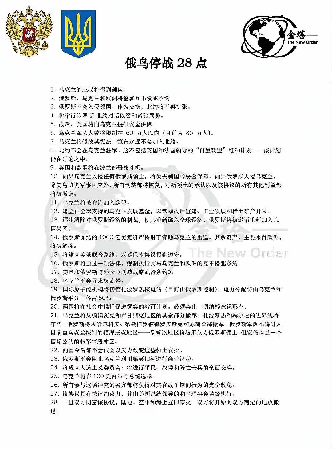 网传美国就乌克兰冲突的“28点和平方案”清单: 注:信息源自网络,仅供参考!