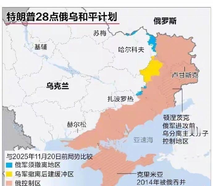 特朗普的28点和平计划: 乌需要从黄区域撤出,俄需要从蓝区域撤出。 黄区减蓝区域相当于3个坡县的面积,也就是说除了俄已占领的大片“红色”区域,乌还要额外割让3个坡县给俄。 俄乌战争