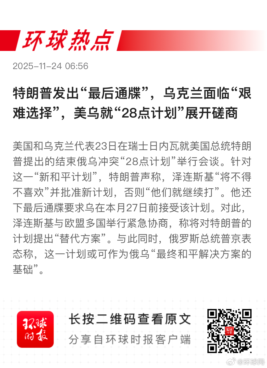 【特朗普称乌克兰领导层对美方努力“毫无感激之情”】当地时间11月23日,美国总统