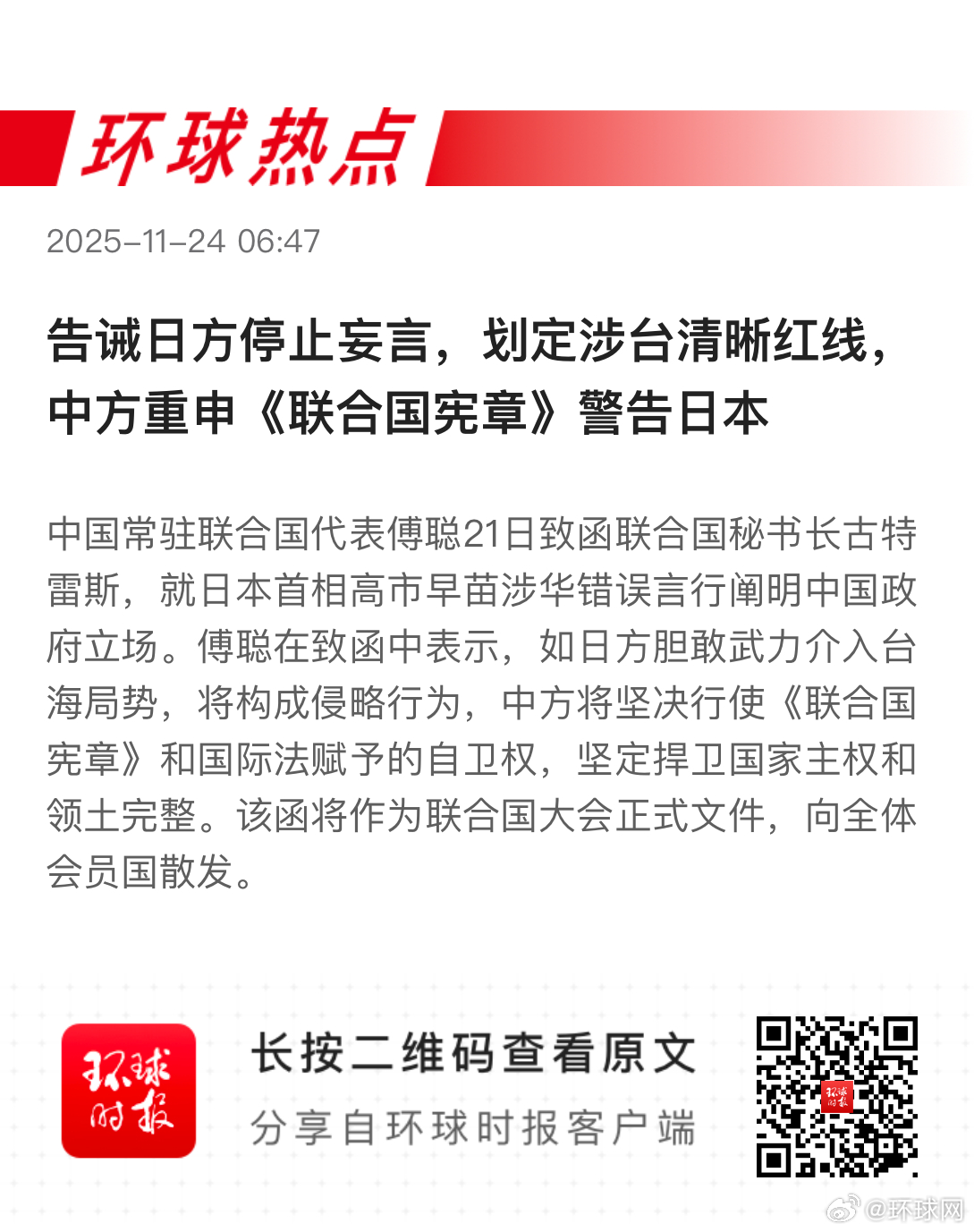 【:日方“愿意对话”的姿态很伪善】中国常驻联合国代表傅聪近日致函联合国秘书长古特