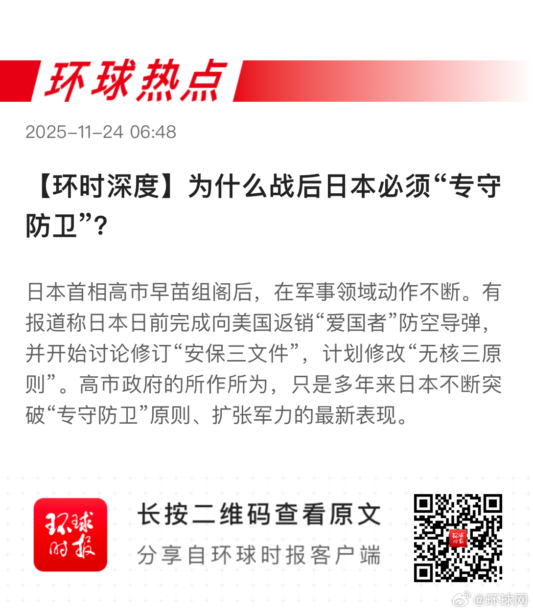 【环时深度丨为什么战后日本必须“专守防卫”?】编者的话:日本首相高市早苗组阁后,