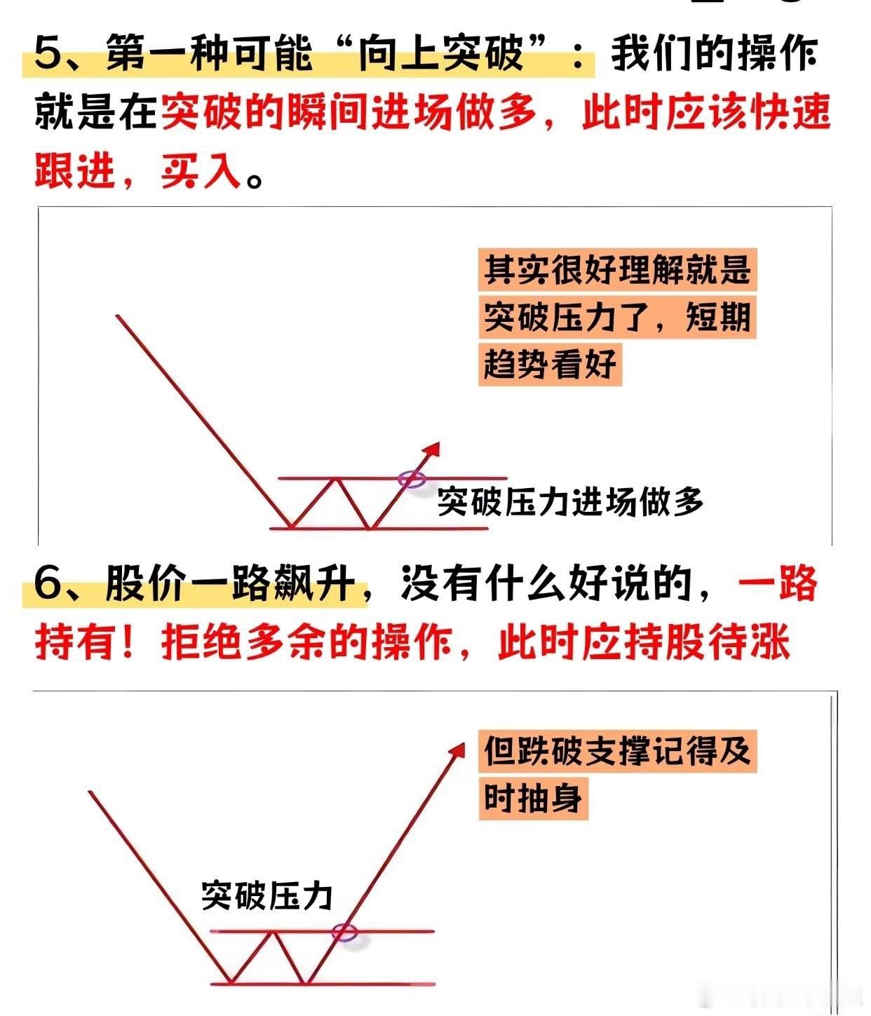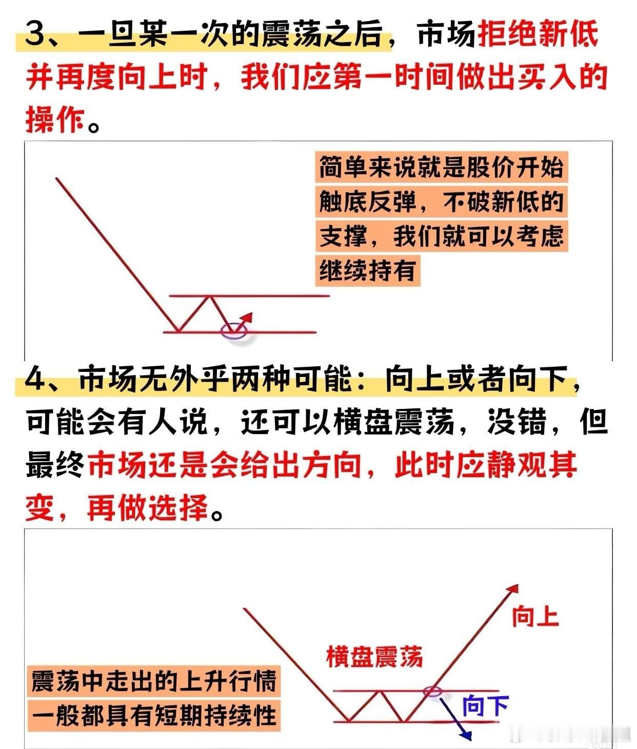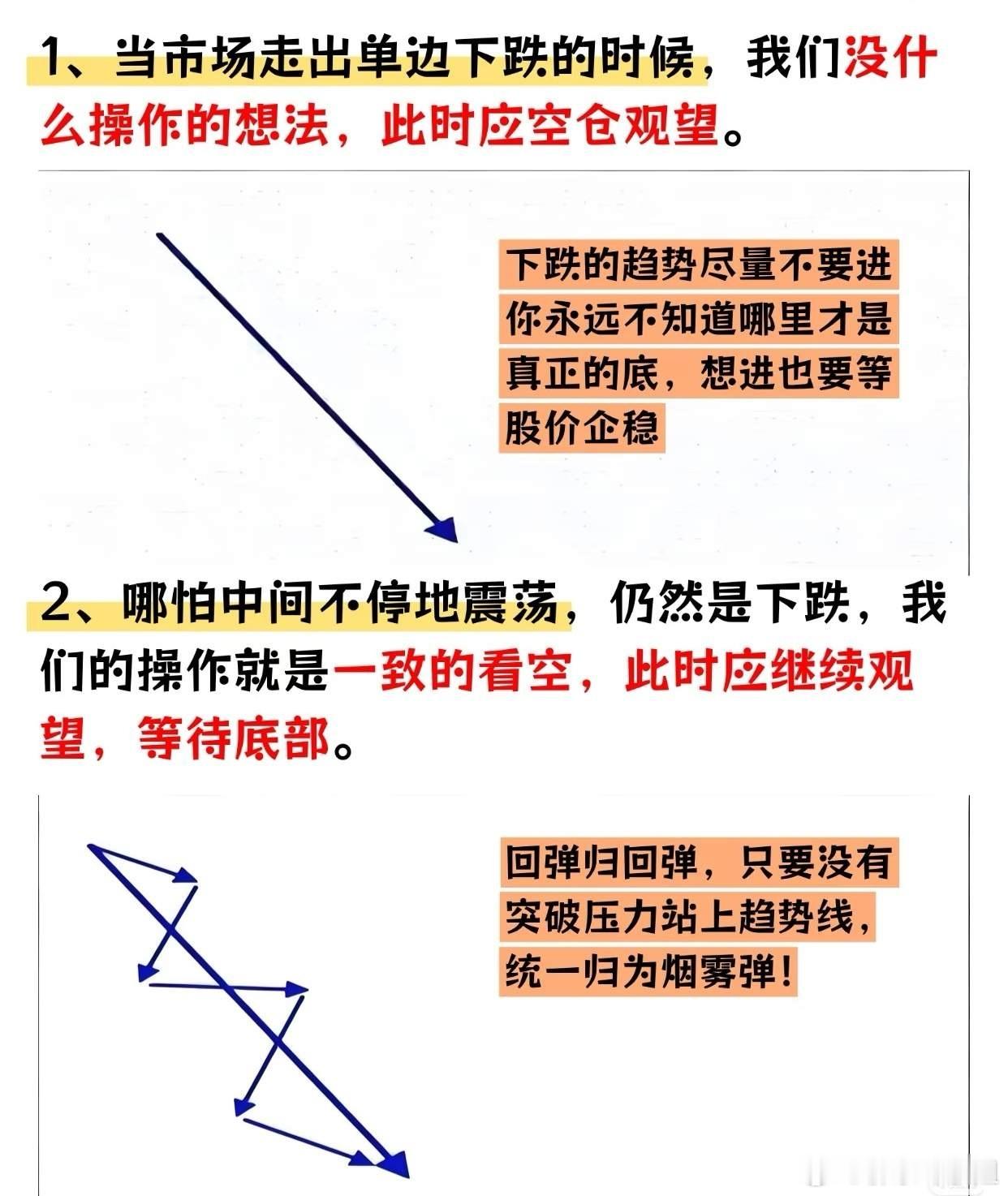围绕“如何判断市场趋势并采取相应操作策略”展开,核心逻辑是根据股价走势的不同阶段,明确何时观望、何时买入、何时持有以及何时退出,帮助投资者建立清晰的买卖纪律。具体内容分为四个关键操作阶段:1. 市场单边下跌或持续震荡下行时:坚决空仓观望当市场呈现单边下跌趋势(明确向下),或虽中间有震荡但整体仍为下跌状态时,正确的做法是保持空仓,不轻易入场。因为无法预判真正的底部,即使出现回弹,只要股价未突破关键压力位(即未站上趋势线),这些反弹都可能是“烟雾弹”(虚假信号),此时应继续等待底部真正形成。2. 震荡后市场拒绝新低并开始反弹时:果断买入当市场经历多次震荡后,若出现“拒绝新低”(即股价不再创新低)且开始向上反转的迹象(比如形成类似“V型”或“收敛三角形”底部形态后回升),这就是明确的买入信号。此时应在股价止跌回升的第一时间出手,因为这种触底反弹且支撑稳固的情况,往往意味着后续可能开启上涨行情,可考虑入场或加仓。3. 股价突破压力位后持续上涨时:坚定持股待涨当股价成功向上突破关键阻力位(压力线),并形成明显的陡峭上升通道(即进入强势上涨阶段)时,最佳策略是“一路持有”,无需进行多余操作(如频繁买卖)。此时短期趋势向好,应耐心享受上涨红利,但需特别注意——如果股价后续跌破下方的关键支撑位(通常是突破前的水平支撑线),则需果断卖出止损,避免利润回吐。总结来说,这套策略的核心是通过观察股价是否创新低、是否突破关键压力/支撑位来判断市场趋势,并据此严格执行“下跌/震荡空仓→止跌反弹买入→突破上涨持股→跌破支撑退出”的操作纪律,帮助投资者规避盲目交易,抓住关键买卖节点。
