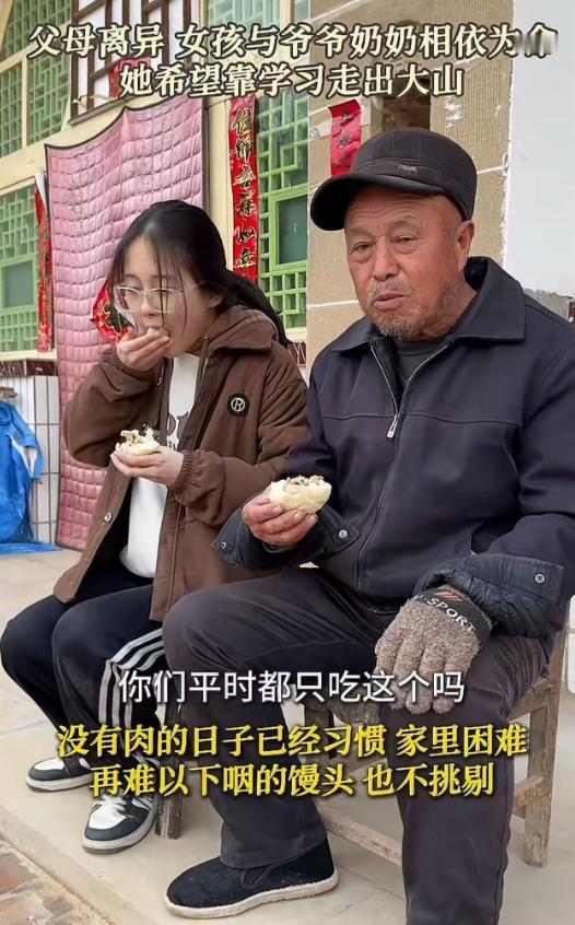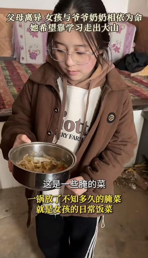 看哭了!父母离异,女孩与爷爷奶奶相依为命,这天志愿者来她家里进行帮扶,看到女孩吃一锅不知放了多久的腌菜,忍不住问她为什么不吃肉?女孩说:“因为肉太贵了,我们平时能吃上腌菜就很不错了!” 乡路绕着山转了十八弯,志愿者的帆布鞋沾着泥点,推开那扇掉漆的木门,院子里晒着半干的青菜,竹匾边缘爬着霉斑,跟屋里飘出的咸酸味缠在一起。 奶奶坐在灶门口添柴,火光映着满脸皱纹,女孩蹲在矮凳上,捧着粗瓷碗扒饭,筷子头戳着锅里的腌菜。 那缸腌菜就放在桌角,陶缸没盖严实,边缘结着白霜,菜叶黄得发暗,看不出原本模样。 “丫头,吃的这是?”穿红马甲的志愿者忍不住问,女孩抬眼,睫毛上沾着饭粒,没说话,只是把碗往怀里拢了拢,奶奶叹口气,手在围裙上蹭了蹭:“秋天腌的,能吃到开春,这样省粮食。” 有人注意到灶台上的铁锅里,除了腌菜没别的,“咋不吃点肉?孩子正长身体,”这话问出口,院子里忽然静了,女孩把最后一口饭咽下去,声音轻得像风:“肉贵,腌菜挺好。” 志愿者摸出随身带的牛奶递过去,女孩没接,转头看奶奶,奶奶点头,她才双手捧着接了,指尖攥得发白。 屋里墙面上,贴满奖状,“三好学生”的字迹被炊烟熏得发淡,墙角堆着捆好的废品,是祖孙仨攒着换钱的家当。 奶奶说孩子爸妈很早便离婚,老头腿不利索,靠种半亩玉米过活,肉要去镇上买,来回二十里山路,逢集才舍得割一两斤,都给孩子留着。 志愿者翻开带来的物资袋,米面油之外,还有两包真空包装的肉肠,奶奶要推辞,被按住手:“这是爱心社统一配的,每个孩子都有。” 之后有人蹲下来帮女孩撕肉肠,油星子溅在她蓝布衫上,她抿着嘴笑,阳光穿过屋梁的破洞,照在腌菜缸上,白霜慢慢化了点。 志愿者里有人悄悄拿手机拍了腌菜缸和奖状,不是要博同情,是记下来,下次多带点肉和鸡蛋来,就像他们在别的山村做的那样,不光给物资,还教老人怎么给孩子做鸡蛋羹,不贵还补营养。 临走时,女孩站在门口挥手,风吹动她洗得发白的衣角,手里还攥着没吃完的肉肠,志愿者回头看,那口腌菜缸仍摆在桌角,但旁边多了袋新米,包装袋上印着的“爱心助学”四个字,在暗屋里亮得很。 这样的场景,在山区不算少见,老人们守着旧习惯省吃俭用,孩子们不懂营养只知懂事。 还好有志愿者翻山越岭送来的不光是吃的,更是让孩子知道,肉不是奢侈品,成长该有的营养和关爱,他们都配得上。