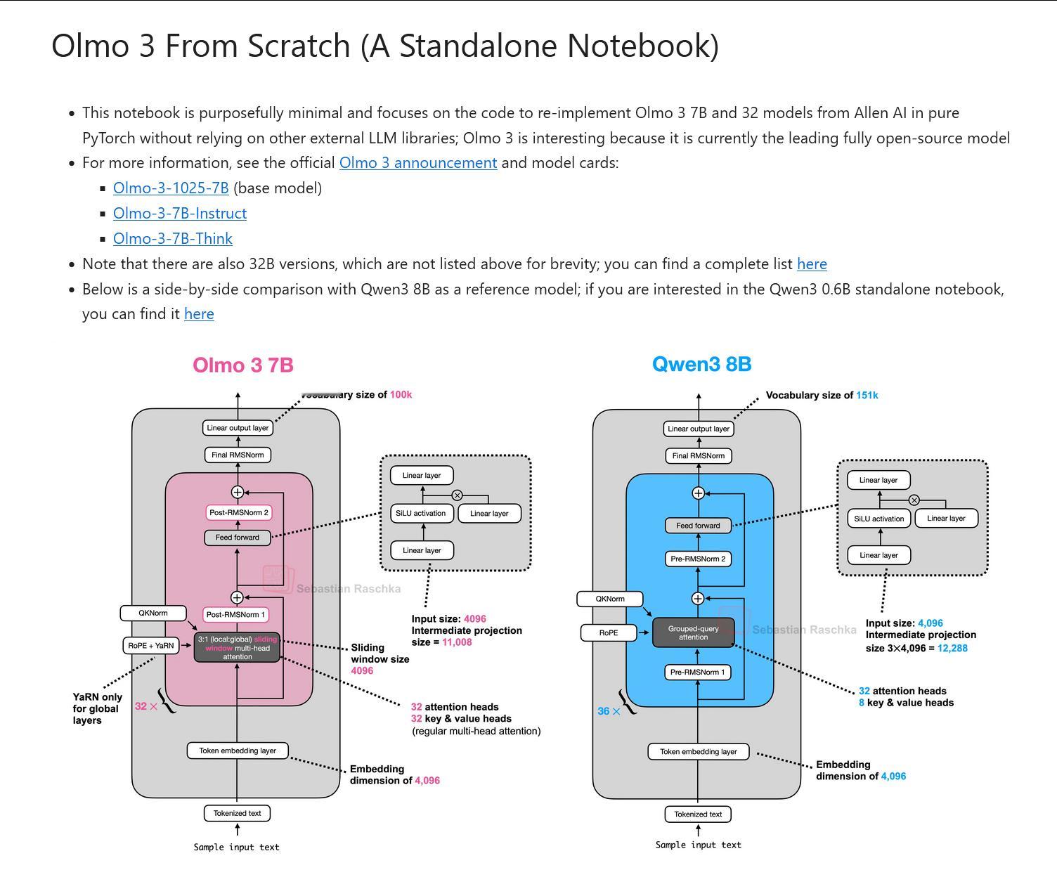 Sebastian Raschka用单个Jupyter Notebook 从零开始实现 Olmo 3 github.com/rasbt/LLMs-from-scratch/blob/main/ch05/13_olmo3/standalone-olmo3.ipynb“用纯 PyTorch 重新实现 Allen AI 的 Olmo 3 7B 和 32 模型,而不依赖其他外部 LLM 库”。当然这里的“实现”指的不是指从头开始训练生成这个模型,而是在不依赖特定模型库的前提下,利用 PyTorch 原生算子重构 OLMo 3 的神经网络计算图(Computation Graph),并通过自定义的Key Mapping Logic,将预训练的 FP16/BF16 权重张量正确加载到该计算图中,从而构建出一个功能等价的推理引擎。