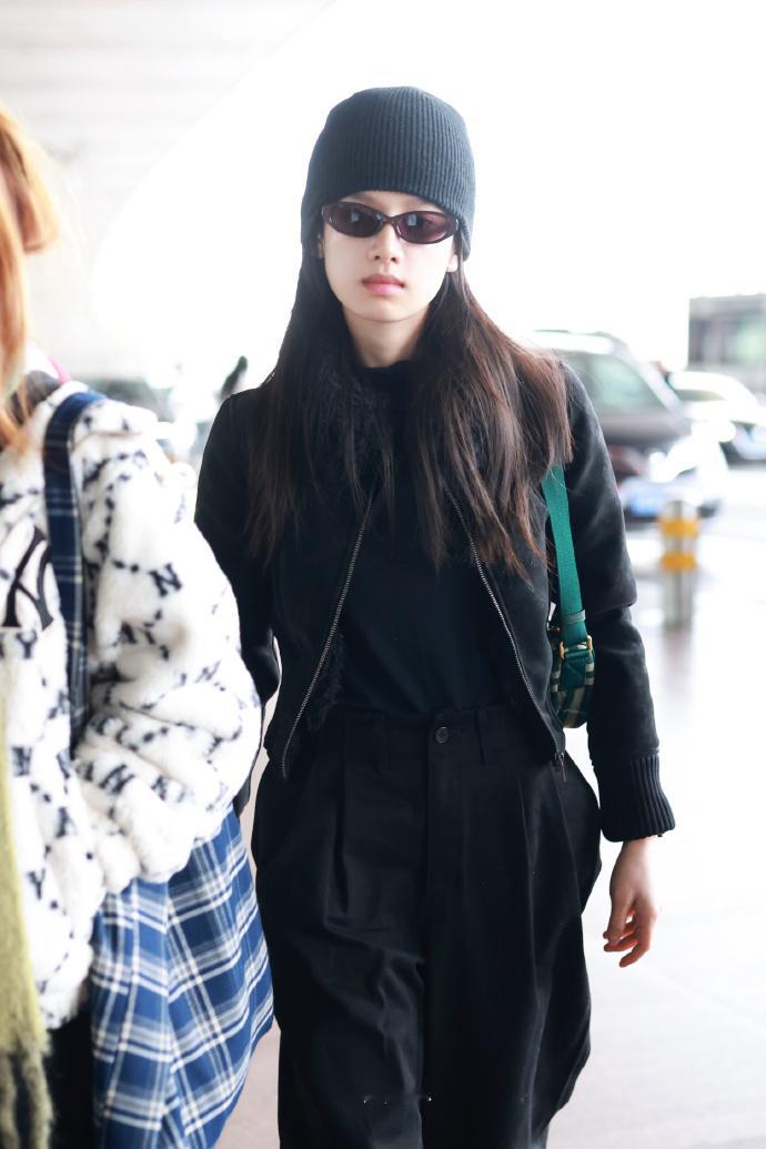 一大早就出发进组的张婧仪,冷帽+all black完全是拽女来的