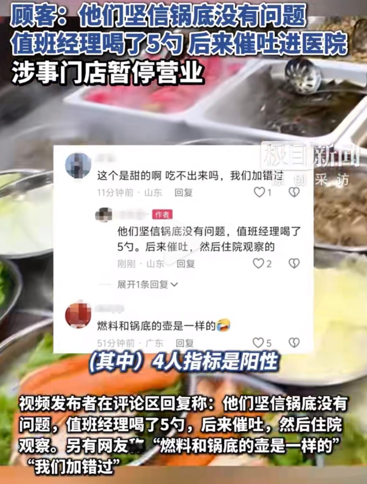 吃顿火锅差点把命丢了!山东这家火锅店的操作,我真是气到肝疼——店员愣是把液体燃料当成汤底倒进锅里,11个食客吃完当场吐得直不起腰,全被送进医院!更荒唐的是,值班经理为了圆谎,居然舀了5勺燃料往嘴里灌,结果自己也被抬去医院催吐,纯属自讨苦吃! 后来听人说,那燃料壶和汤底桶长得跟双胞胎似的,连个区分的标签都没有!还有网友爆料,这家店之前就加错过一次,就因为没出大事,居然就这么糊弄过去了。我真是越想越气,食品安全这可是人命关天的事啊,怎么能这么不当回事?! 辣味锅底把燃料的怪味盖过去了,直到大家开始恶心呕吐,才发现不对劲。现在涉事门店关了门,电话也打不通,可那些食客遭的罪、心里的阴影,谁来负责? 餐饮行业的容器混用就是定时炸弹,一次疏忽就是拿顾客的命开玩笑。希望这次能查到底,也提醒所有商家:别等出了人命才重视安全,早规范早安心!火锅店意外事件 火锅店事故 火锅加汤底加成燃料