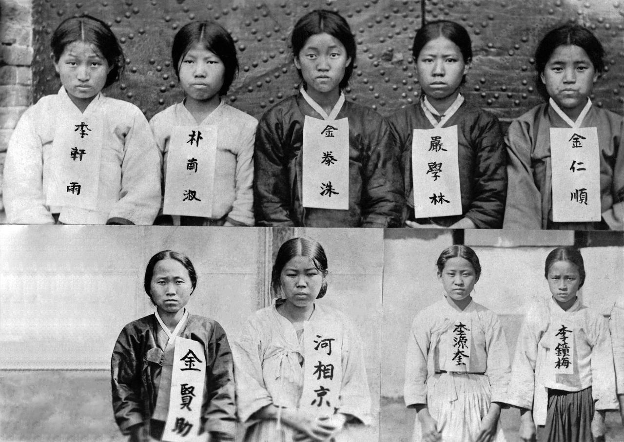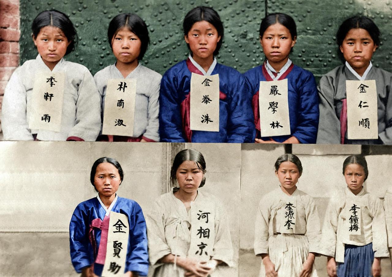 这些是日本殖民统治时期朝鲜半岛的女性独立运动成员。她们身着传统服饰,胸前标注姓名,是在反抗日本殖民压迫的斗争中被捕的。 在朝鲜半岛反抗日本殖民统治的历程中,无数女性挺身而出,她们或参与示威游行,或从事地下宣传,为民族独立事业贡献力量。