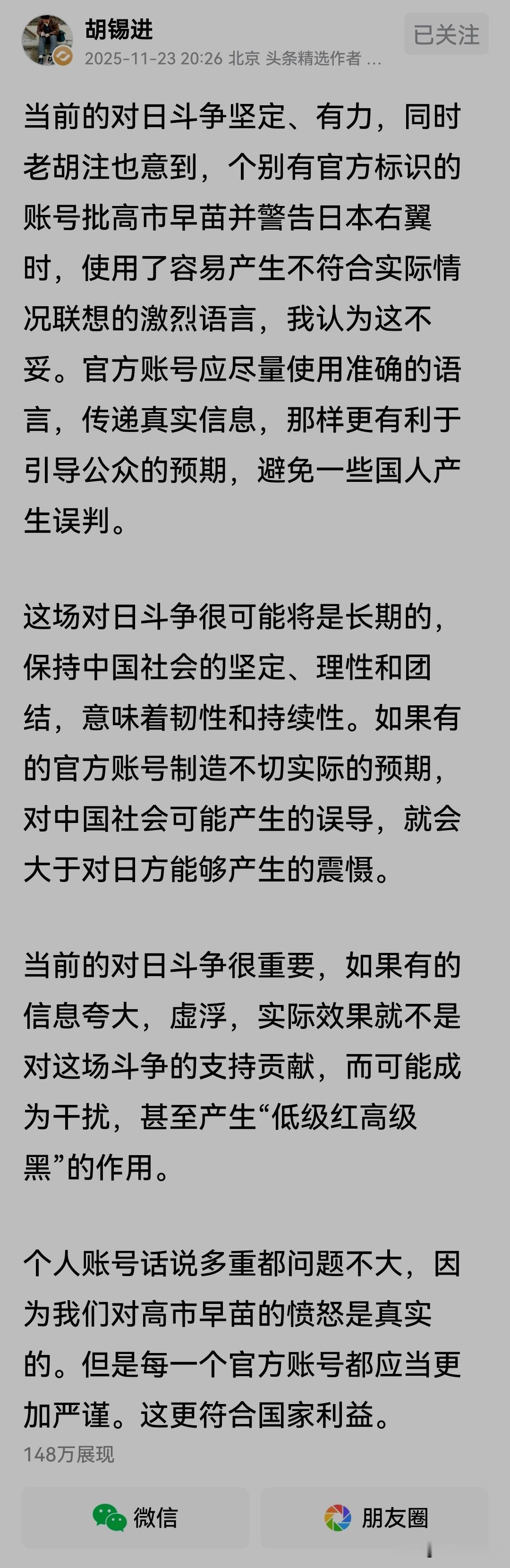 近段时间,由于日本女首相高市早苗的错误言论,引发我们官方和民间的强烈不满!网友们纷纷留言:不管是早苗、晚苗、毒苗,最怕的是人民解放军的火苗……官方也有账号表述观点:执意要与14亿多中国人民为敌,那么等待它的必将是比80年前更为彻底的失败! 正在全国人民上下一心,同仇敌忾期间,11月23日,@胡锡进 发帖子提醒:官方账号对日发文时要避免激烈言词!老胡表示,当前对日斗争坚定有力,但注意到有官方账号发文的言词过于激烈,老胡认为这样容易让民众产生误判。 老胡声称,官方账号如果把分贝拉得过高,让民众期待过大,最后如果事态没朝民众期待的方向发展,民众就会产生失望情绪,这样反而是“低级红高级黑”,对日的威慑效应会递减。 在如此敏感的时间段,胡锡进发布这样的帖子,引发了众多网友的反感!其中有一位网友在评论区这样留言:“人的汗液一般是酸性的,但在氧气消耗过多情况下大量出汗汗液就偏向碱性,所以这种就是避氧的汗碱!”想不到,这条不伦不类的评论,竟然获得了很多网友点赞!刚开始没有理解这条评论的内在含义,仔细分析之后发现,似乎在批评老胡是“汉奸”! 说实在的,我们平时确实不太赞成老胡左右摇摆的观点。但是,这次感觉老胡说的比较冷静客观。为什么感觉老胡比较客观呢?这个时候想到了周总理的外交风采,在一次外交场合,我们的周总理主动向美国国务卿杜勒斯伸出了手,杜勒斯却拒绝和周总理握手……杜勒斯的高傲态度,反而更能体现周总理的风度。数年后,美国总统尼克松来访,为了弥补杜勒斯当年丢的丑,还没下飞机就向我们的周总理伸出了双手! 这就是外交,用最软的话办最强硬的事,最文雅的语言和姿态去藐视对手!