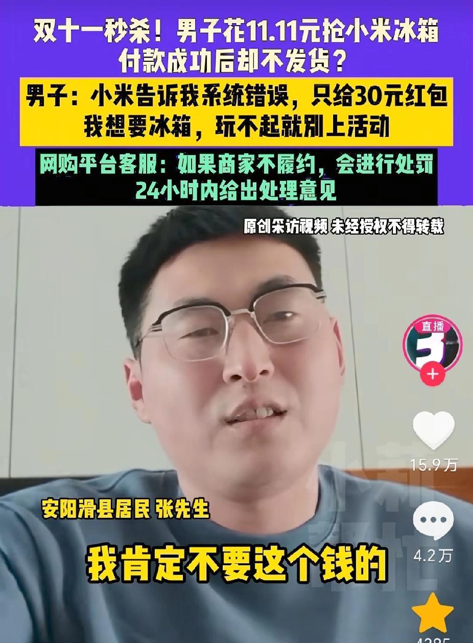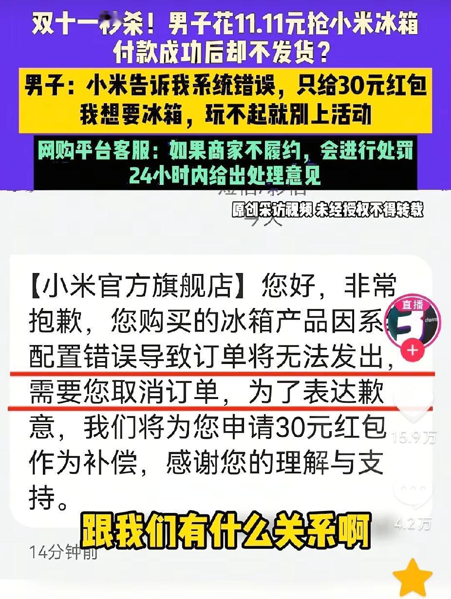 “小米:你玩儿不起就别玩儿啊!”小米最近是真露脸啊!前几天潜水手表的事还没完,最近又引发消费纠纷。 事件起因是小米官方旗舰店双11线上秒杀活动。推出线上用户可花11块1毛1元秒杀3开门冰箱活动,结果河南安阳一男子真的成功秒杀到该冰箱了。 原本以为真的可以喜提冰箱,毕竟小米这么大的企业,不至于说话不算数吧?可就是小米能干出来的事。 11月17日,该男子在等待发货时,收到小米官方的短信,称因系统显示故障订单无效,要求他撤销订单,并且愿意赔偿30元红包儿。 此操作也真是让人大跌眼镜,该男子非常不满,在网上喊话:“小米,你玩儿得起就玩儿,玩儿不起就别玩儿,我不想要红包儿,我就想要冰箱。” 网友开始热议,如果从维权角度来说,你商家自身系统故障,凭什么取消有效订单呢?那是你们自身的问题。网友都向着男子说话。别说是商家了,就是个人也应该说话算话,怎么能出尔反尔? 这30元的红包的事,可是丢了小米的大脸呀。所以商家开展促销活动时,应确保系统稳定和活动规则的严谨性,避免此类纠纷发生,维护自身的品牌信誉和消费者的信任。 网友嘲讽:这就是小米能干出来的事。真的很丢脸,我买彩票中500万,难道你告诉我摇号机器出问题了,不兑奖了?