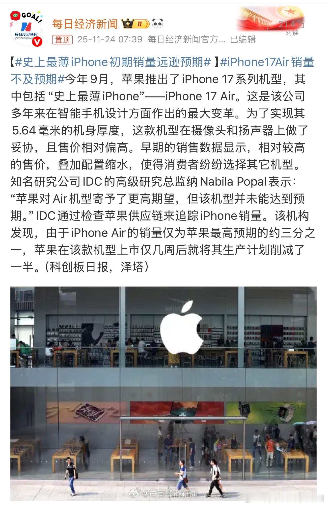 很多人还是没搞清楚,Air不属于17系列,没有iPhone 17 Air,Air是独立系列,叫iPhone Air,至于销量,目前看的确属于小众的狂欢,喜欢的人的确非常喜欢,爱不释手,但是由于esim普及度➕价格等原因,很多人只买一台手机的情况下,价格差不多的情况下,17 Pro系列肯定更划算,所以今年17系列大爆,但是Air销量略显惨淡。