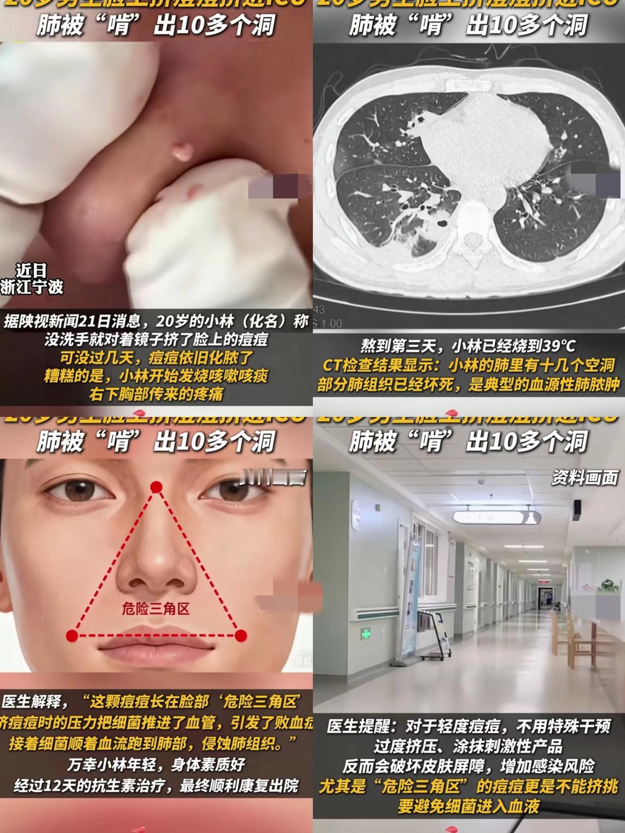 我敢打包票, 不仅20岁大学生没想到, 就连屏幕前的观众也没有料想到,长在脸上一颗平平无奇的痘痘,竟然要了这名大学生的半条命。 脸上因熬夜长出的痘痘,经过手一挤后,竟然直接进入ICU。听起来挺悬的吧,如果不是视频中报道,我打死也不会信。 医院初步诊断,患有血源性肺脓肿。肺部不仅有几个空洞,甚至部分肺部已经坏死。 医生解释,挤痘痘时,细菌进入,导致肺部感染。 看来以后脸上有痘痘都不能轻易去挤了,谁也不能确定下一个会不会是自己。 不过我还是有一个疑惑,这个病,真的是挤痘痘后才得上的吗?你怎么看?
