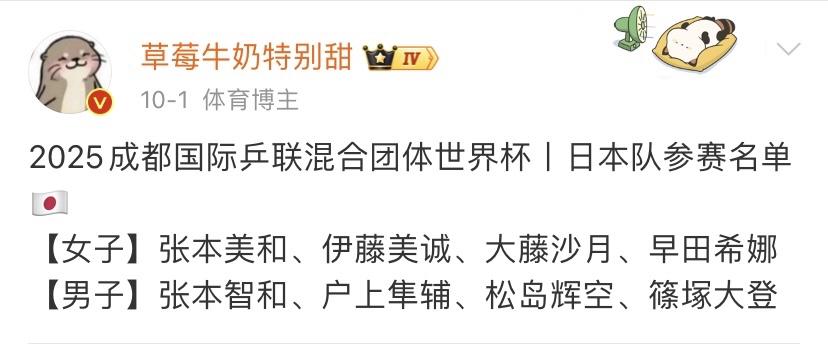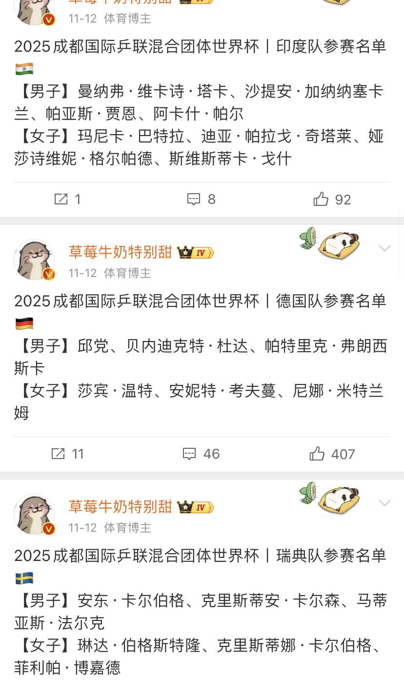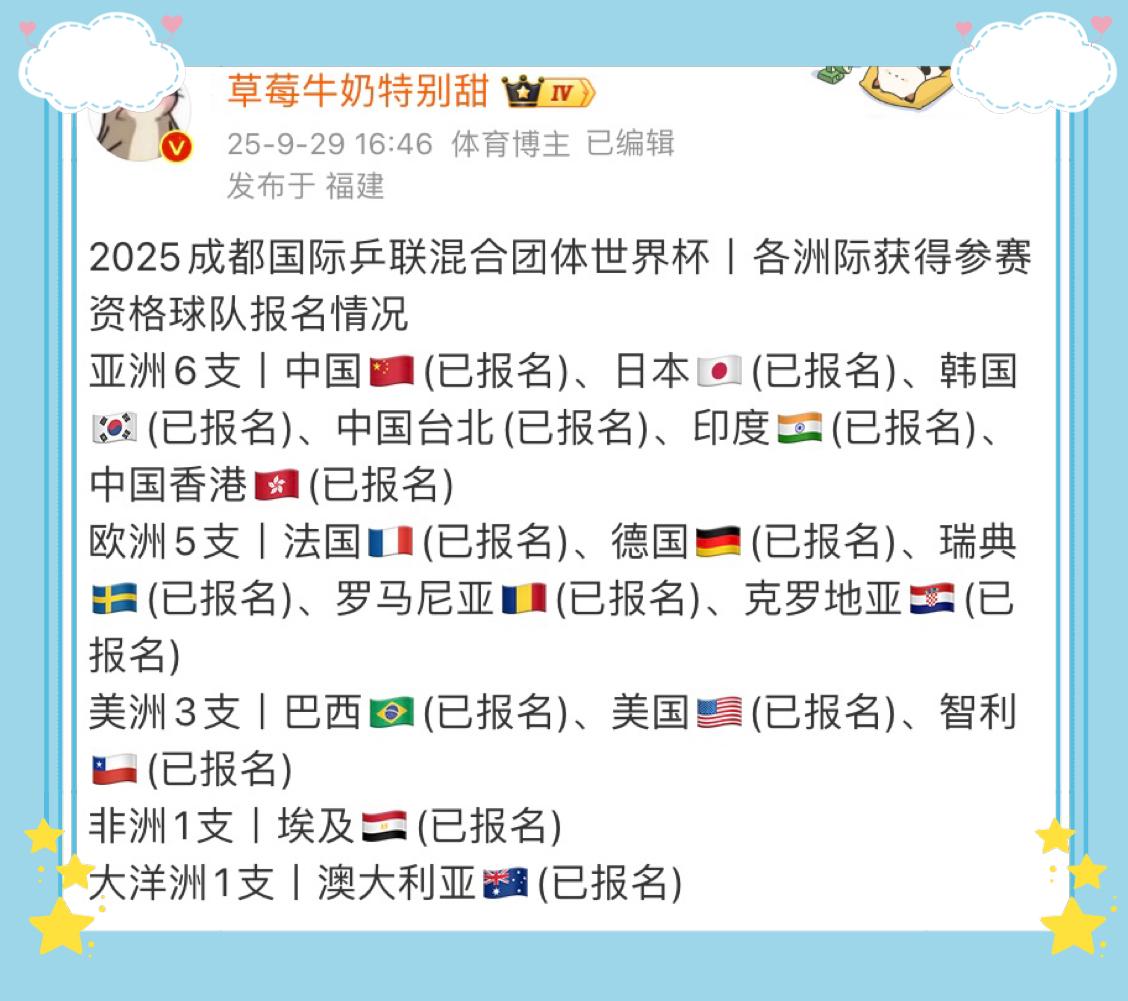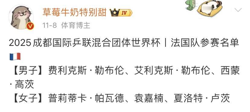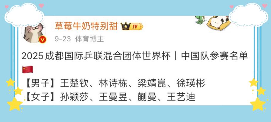 11月30日即将开始的成都混团,新赛制15局8胜制,压力还是有的。 孙颖莎王楚钦领衔。 全运会结束了,大家各自都回到省队或者体总, 之前回省队的运动员,昨天也都回到了体总, 林诗栋他们都是昨天回北京的。 简单休息了两天, 今天开始布置和备战成都混团, 预计是26号出发去成都,准备比赛。 成都混团场馆抢先看,内部布置很喜庆,一共是两张球台。 这是今天的内部的场景, 今年全部都是红色的, 超级喜庆的颜色,看起来就很喜欢。 场馆不是特别大, 有两张球台,会同时开赛。 有人说这个比赛必须要打吗? 是的,必须要打, 升国旗的比赛,且在我们中国进行, 不只是要打,还要打好。 另外,这是洛杉矶奥运会的新项目, 大家也都在摩拳擦掌,试着拿下这块金牌, 所以,这个比赛必须要打。 如果奥运阵容就这四个人参加, 这是如果,不可能是这四个人哈,这个可以放心。 那四个人就要磨合好,把混团的每一盘都要打好,这是关键。 一共有16支球队参加比赛,目前全部都报名, 且参赛人员也已经报名。 创新赛制:15局8胜制 顺序固定:混双→女单→男单→男双/女双。 每盘打满3局:每局胜负均计入总比分,先赢8局的队伍获胜,极大提升单局对抗的悬念。 选手限项:每场每名球员最多参加两个单项。 中国队有王楚钦,林诗栋,梁靖崑,徐瑛彬, 孙颖莎,王曼昱,蒯曼,王艺迪。 所有人都是连轴转的比赛, 并且王曼昱颈部有伤,王楚钦梁靖崑也在身体恢复中, 王艺迪全运会明显是疲劳状态, 对于队伍是一个考验, 男队徐瑛彬是否可以担起重任,就看这一次了。 日韩等其他队伍,也都是最强阵容参赛, 基本都是熟悉的名字,松岛辉空,张本一家,早田,大藤,申裕斌,考夫曼,邱芳,勒布伦等等等等, 大家基本都来了。 比赛时间:11.30-12.7日 期待精彩的赛事。