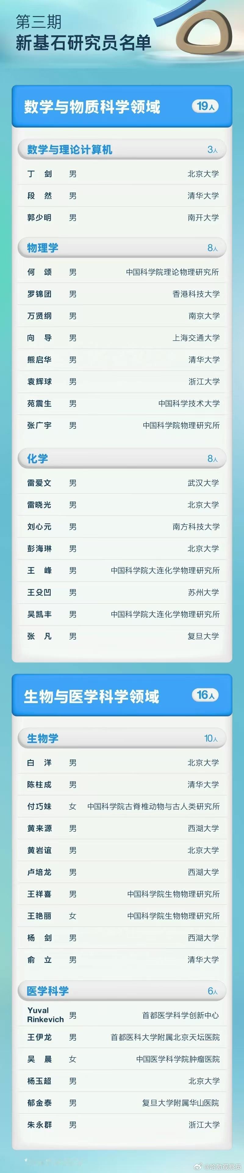 2025年“新基石研究员项目”名单公布!今天上午,西湖大学校长、“新基石研究员项目”科学委员会主席施一公在介绍了新基础研究员项目后,公布了第三期资助名单。这次项目共吸引了669名学者报名申请,最终35人折桂。 今年的资助名单中,平均年龄45岁,最小年龄仅35岁。他们来自18家单位,其中西湖大学有3位学者入选。