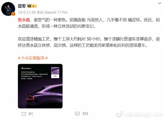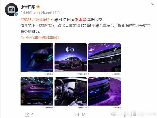 小米YU7 Max紫水晶实拍 雷军:50小时手工打磨媲美劳斯莱斯近日在广州车展期间,小米YU7 Max紫水晶首次对外展出。今日,小米汽车官方公布了一组新车的实拍美图。“镜头装不下这份惊艳,欢迎大家亲临17206小米汽车展台,近距离感受小米定制服务的魅力。”小米汽车官微表示。据小米汽车设计师田原介绍,紫水晶车漆是小米定制服务提供的一种特殊车漆,有一种“不张扬的高级感”,它采用双层清漆工艺,既还原了色彩的准确度,又把“光泽”锁进车漆,历经近50小时的手工打磨,最终呈现深邃和璀璨的丰富质感。此前,雷军曾在微博上特别介绍过紫水晶车漆:“紫水晶,很贵气的一种紫色。如镜面般 光亮照人,几乎看不到 橘皮纹。而且,如水晶般通透,形成一种立体流动的光影变幻。双层清漆精抛工艺,整个工序大约耗时 50小时。整个漆膜比普通车漆厚很多,很好还原水晶立体感、层次感。这样的工艺媲美劳斯莱斯和宾利的顶级豪车。”