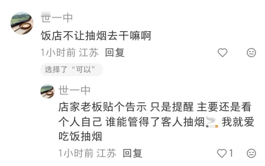大家怎么看待在饭店库库抽烟的人群 今天看到一个帖子,是在饭店吃饭的,店内明确贴了禁止抽烟的告示,却还有人一直在一边抽烟一边吃饭,底下还有人赞同的,大家对此怎么看? 仅作讨论 发表个人观点就行了 不要ky吵架 公共场所禁止吸烟 室内禁止吸烟 做有素质的人 总会遇到有些没有素质的人 珍爱生命远离烟草