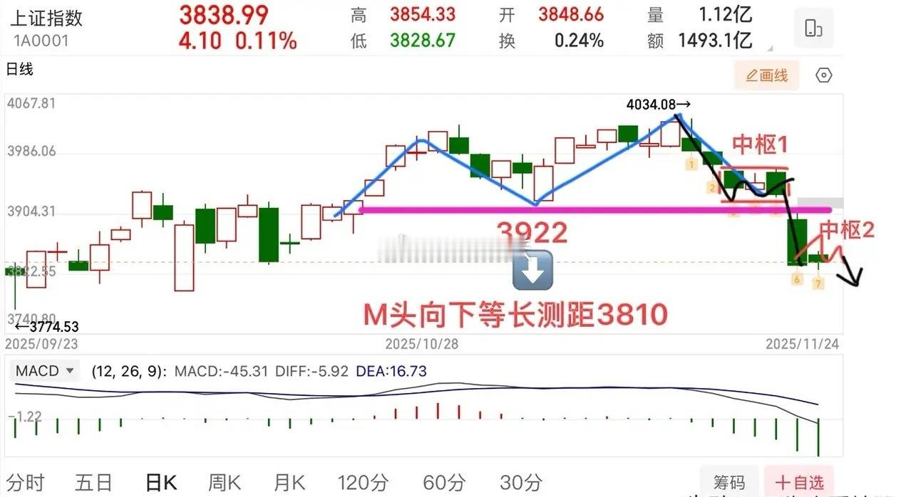 2025.11.24周一早评: 上证指数小幅高开,但量能并未放大,总体弱势震荡整理为主,中证2000强一些,小盘有修复。 大盘观点:上证指数跌破3922颈线,结构上看,回到了9-10月份大的中枢箱体震荡。目前来看,调整还未见结束,但短线有修复反弹(周五美股/富时A50上涨),macd指标开口过大以及5日线有一定的乖离,技术面也有修正的需求。 技术面看,从4034开始的向下走势,大概率构建第二个中枢,关键压力3878,不能有效突破多空就还会有上下拉锯的过程,完成中枢再向下是一个相对的安全区,两中枢后背驰的概率大。 个人观点,仅供参考!
