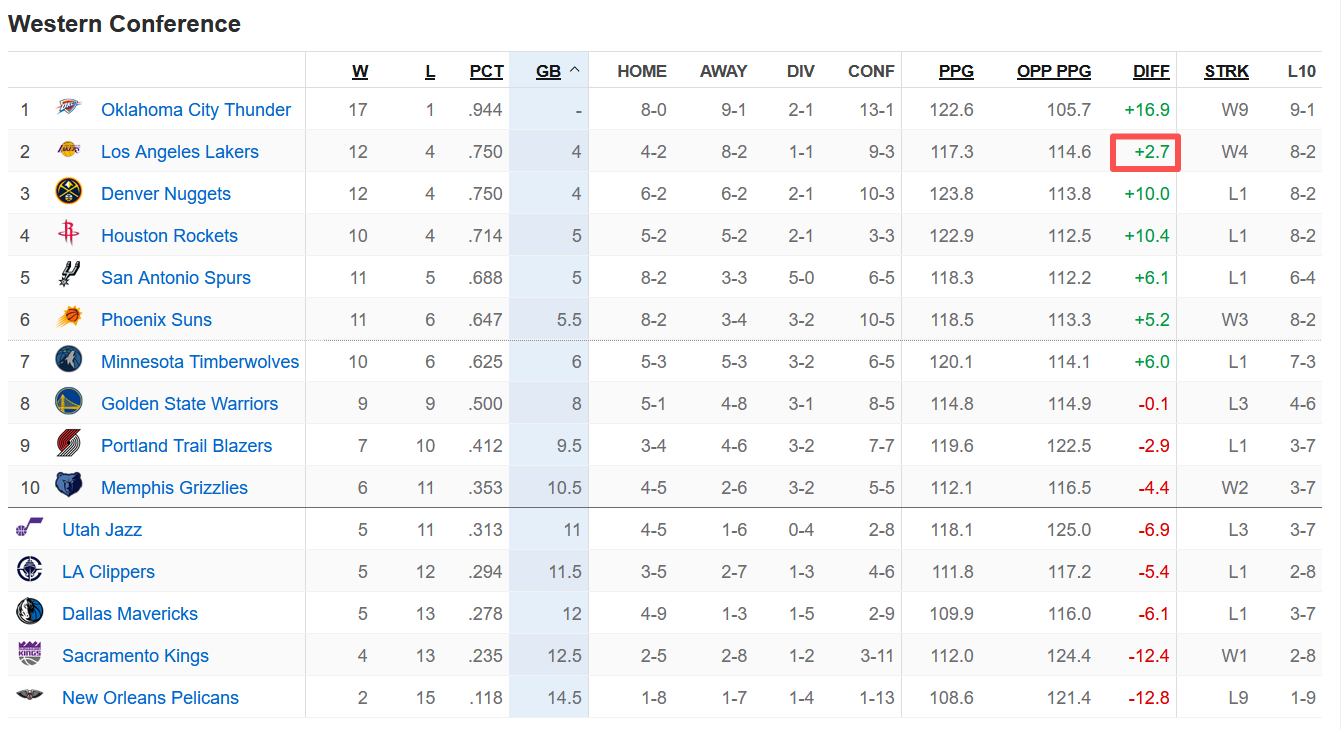 就很魔幻。虽然排在西部第二,但湖人的净胜分在前八里只比勇士强点。输起来就是爆输,赢的时候就赢一点点,打到关键时刻又全赢…