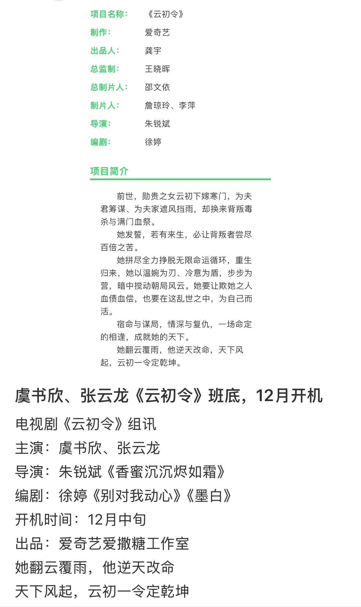 虞书欣、张云龙《云初令》班底,12月中旬开机