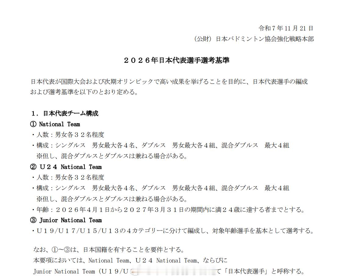 日本国家队2026年选拔标准:*新增U24国家队日本国家队由三部分组成:1. 国家队人数: 男女各约32名构成:单打:男女最多各4名双打:男女最多各4对混合双打:最多4对※但混双选手与双打选手可能为同一人(兼项)。2. U24国家队*年龄条件: 在2026年4月1日至2027年3月31日期间满24岁及以下者。人数: 男女各约32名构成:单打:男女最多各4名双打:男女最多各4对混合双打:最多4对※但混双选手与双打选手可能为同一人(兼项)。3. 青年国家队分类: 由 U19 / U17 / U15 / U13 四个年龄组构成,基本以各年龄组对应的选手为选考对象。