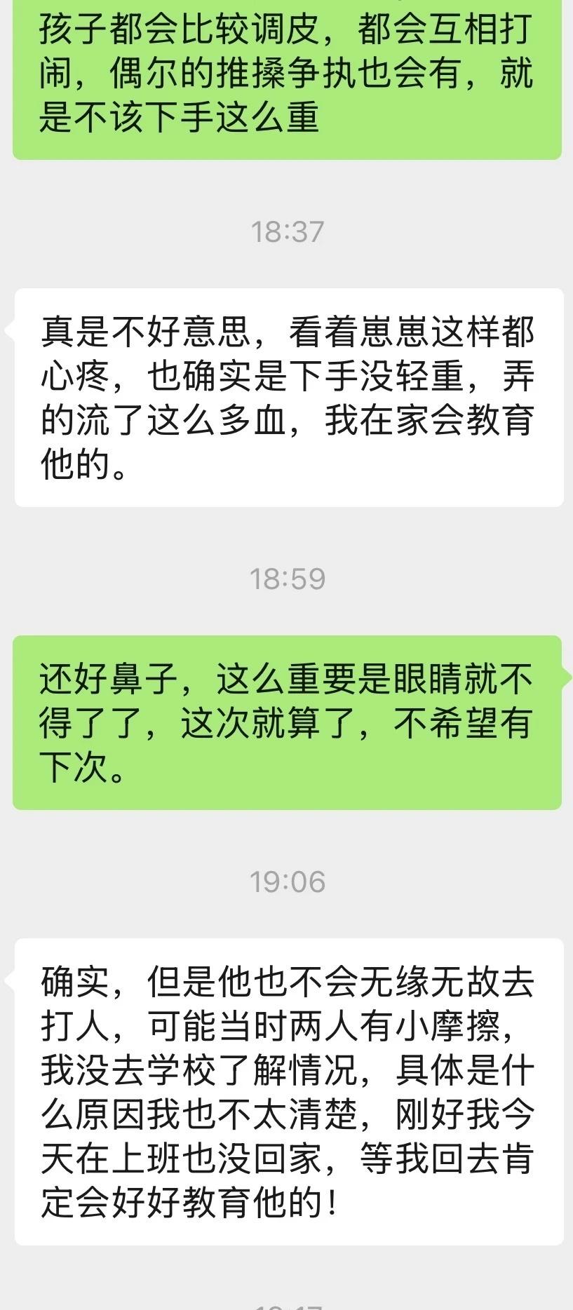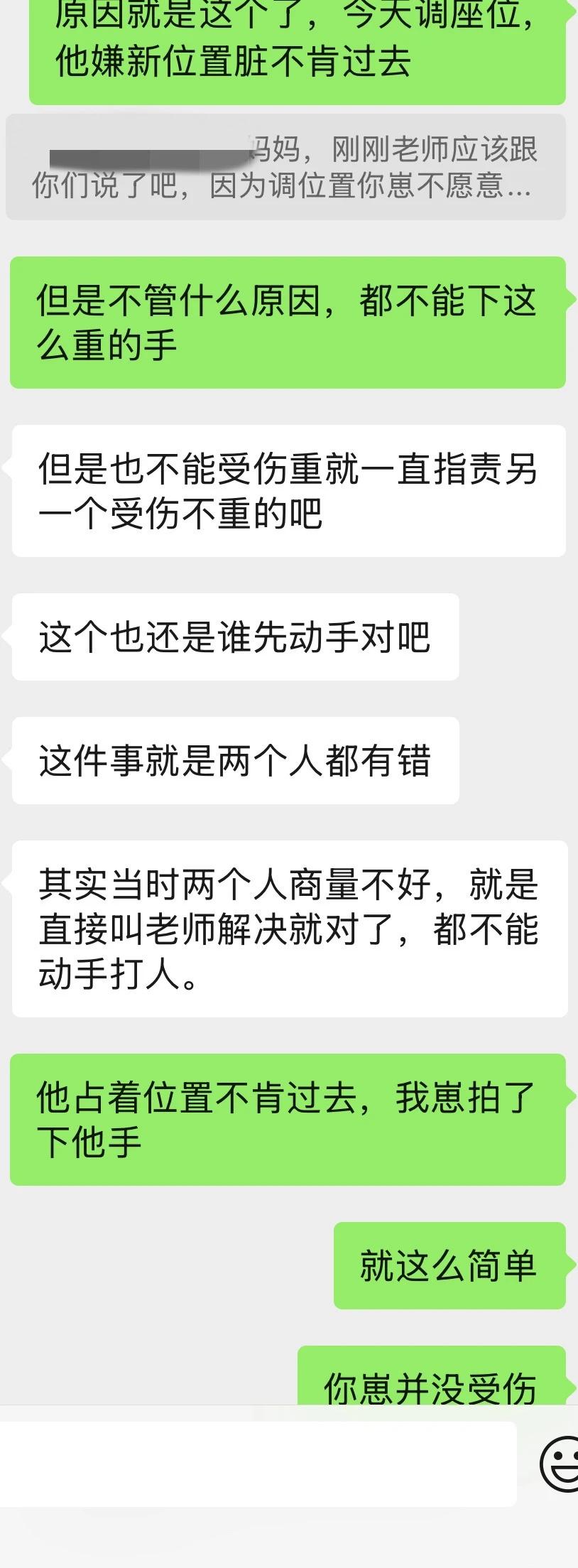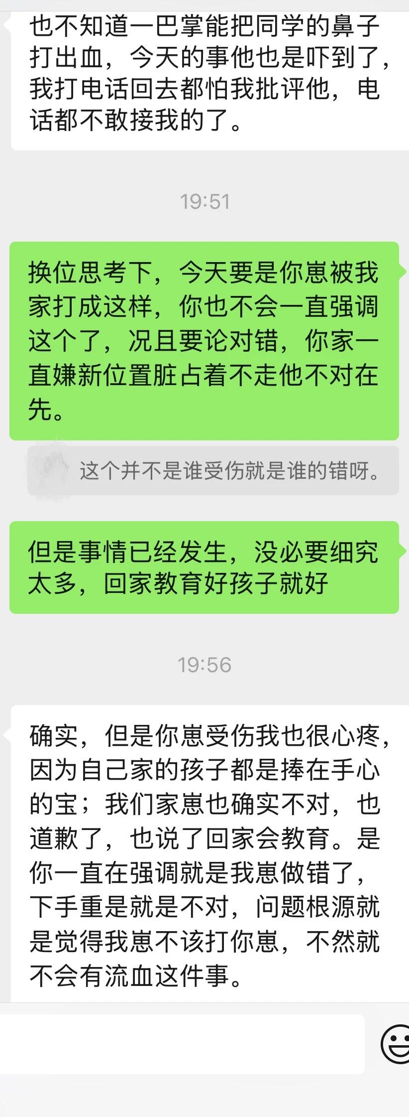 一年级孩子打架后续 起因是老师调了座位,让我儿子坐到同学的位置,同学觉的新位置脏不肯过去,我们家口头说了让他过去,他就是不走,所以急了拍了他手,他朝我儿子脸打了一巴掌,导致鼻子大出血,流的身上都是,后面老师在办公室让那小朋友道歉,当时是小朋友奶奶在,说了几次他才很不情愿的道歉了,我想着就算了,回家加了同学妈妈,想着告知一下今天这事,让其加强教育不能对同学下重手,同学爸爸态度还行,第一时间打电话道歉了,大家觉的碰到这种事,该怎么处理?希望每个孩子都被保护 一年级 小朋友吵架 小朋友打架 小学生打架 家长的责任 一年级新生 孩子打人 孩子打架
