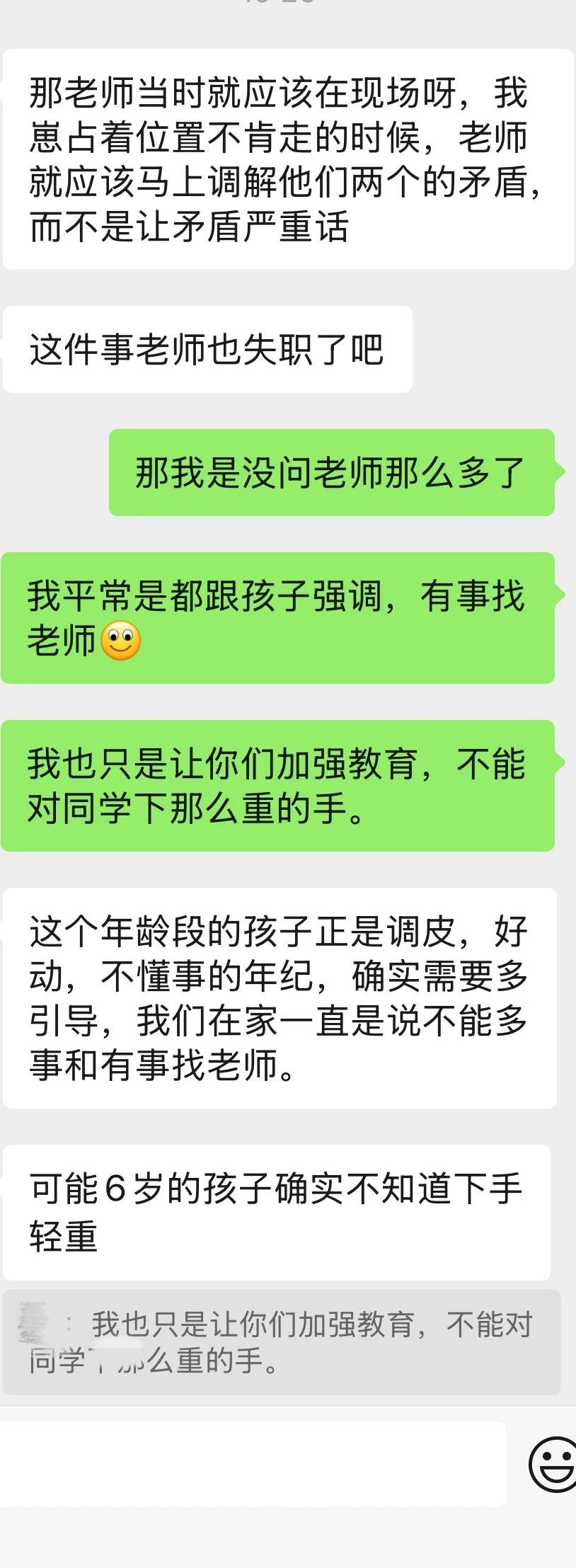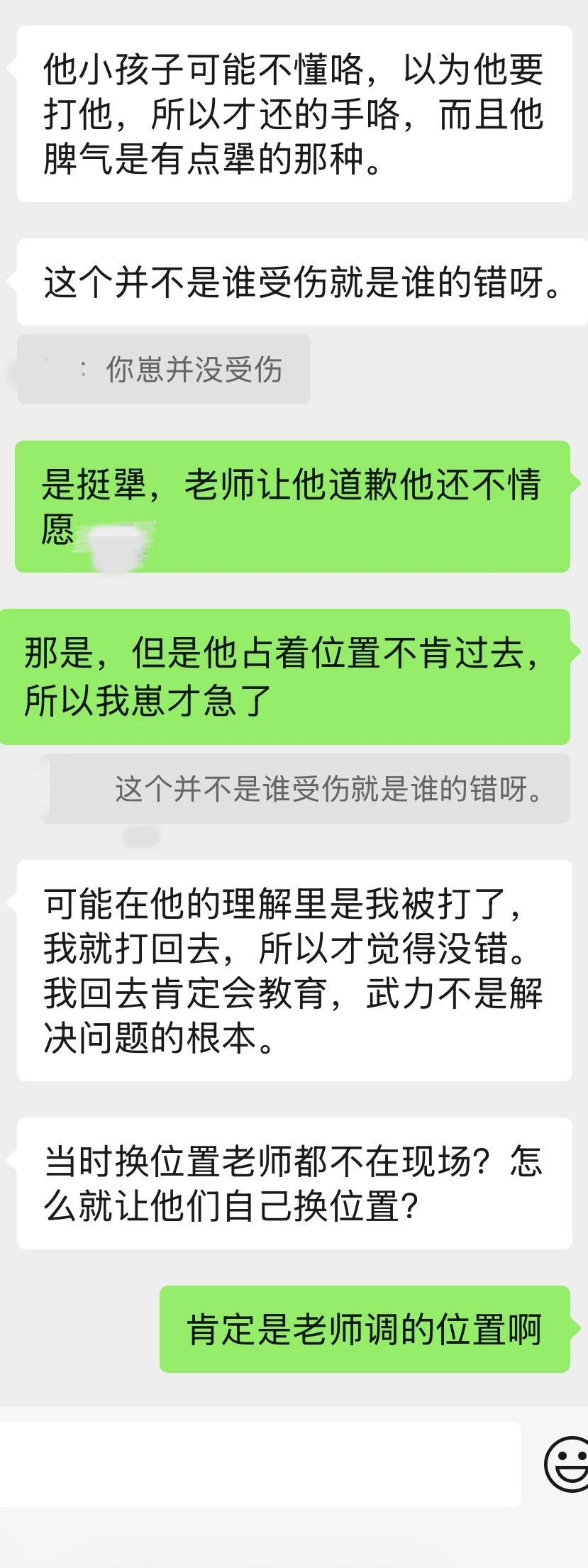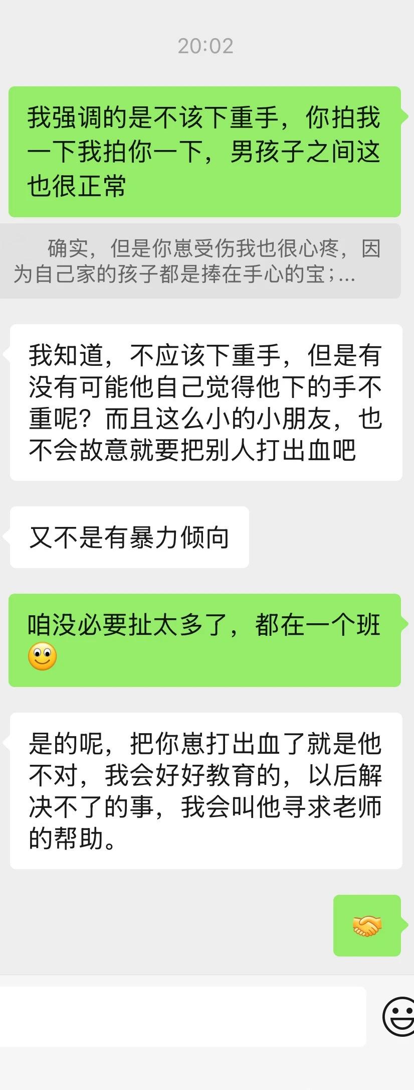 一年级孩子打架后续 起因是老师调了座位,让我儿子坐到同学的位置,同学觉的新位置脏不肯过去,我们家口头说了让他过去,他就是不走,所以急了拍了他手,他朝我儿子脸打了一巴掌,导致鼻子大出血,流的身上都是,后面老师在办公室让那小朋友道歉,当时是小朋友奶奶在,说了几次他才很不情愿的道歉了,我想着就算了,回家加了同学妈妈,想着告知一下今天这事,让其加强教育不能对同学下重手,同学爸爸态度还行,第一时间打电话道歉了,大家觉的碰到这种事,该怎么处理?希望每个孩子都被保护 一年级 小朋友吵架 小朋友打架 小学生打架 家长的责任 一年级新生 孩子打人 孩子打架