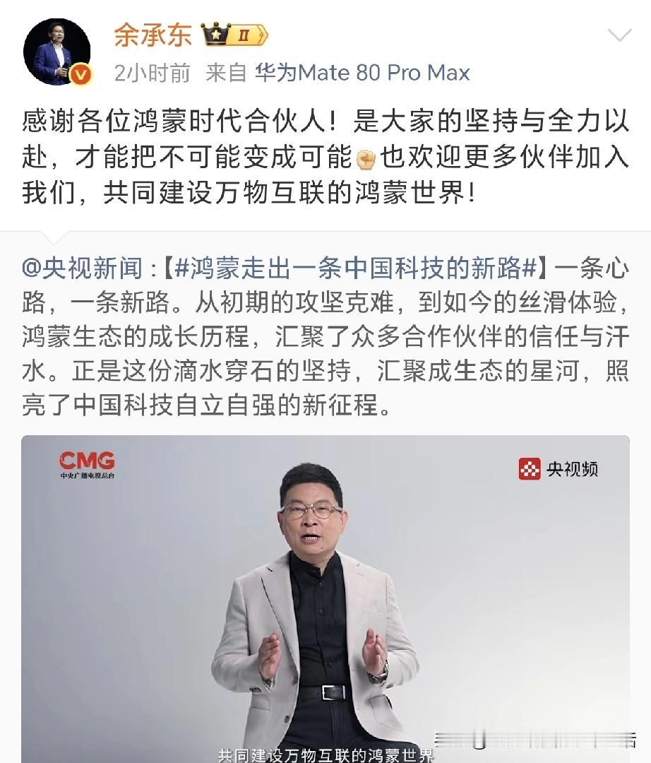 余承东感谢各位鸿蒙时代合伙人! 余总表示是大家的坚持与全力以赴,才能把不可能变成可能! 三分天下,必有鸿蒙!鸿蒙走出一条中国科技的新路! 从一个全新的操作系统,对它一无所知,不确定性,焦虑,没什么底气,再到终端设备突破2000万,三分天下,鸿蒙有鸿蒙其一!其实背后的是鸿蒙合作伙伴与华为鸿蒙人一份份的努力付出,滴水石穿的坚持,正是这份坚持与全力以赴,把不可能变成可能。 没有退路,就是胜利之路,无数星光汇聚,照亮了这片璀璨的生态星河,照亮了中国科技自立自强的新征程。鸿蒙加油!