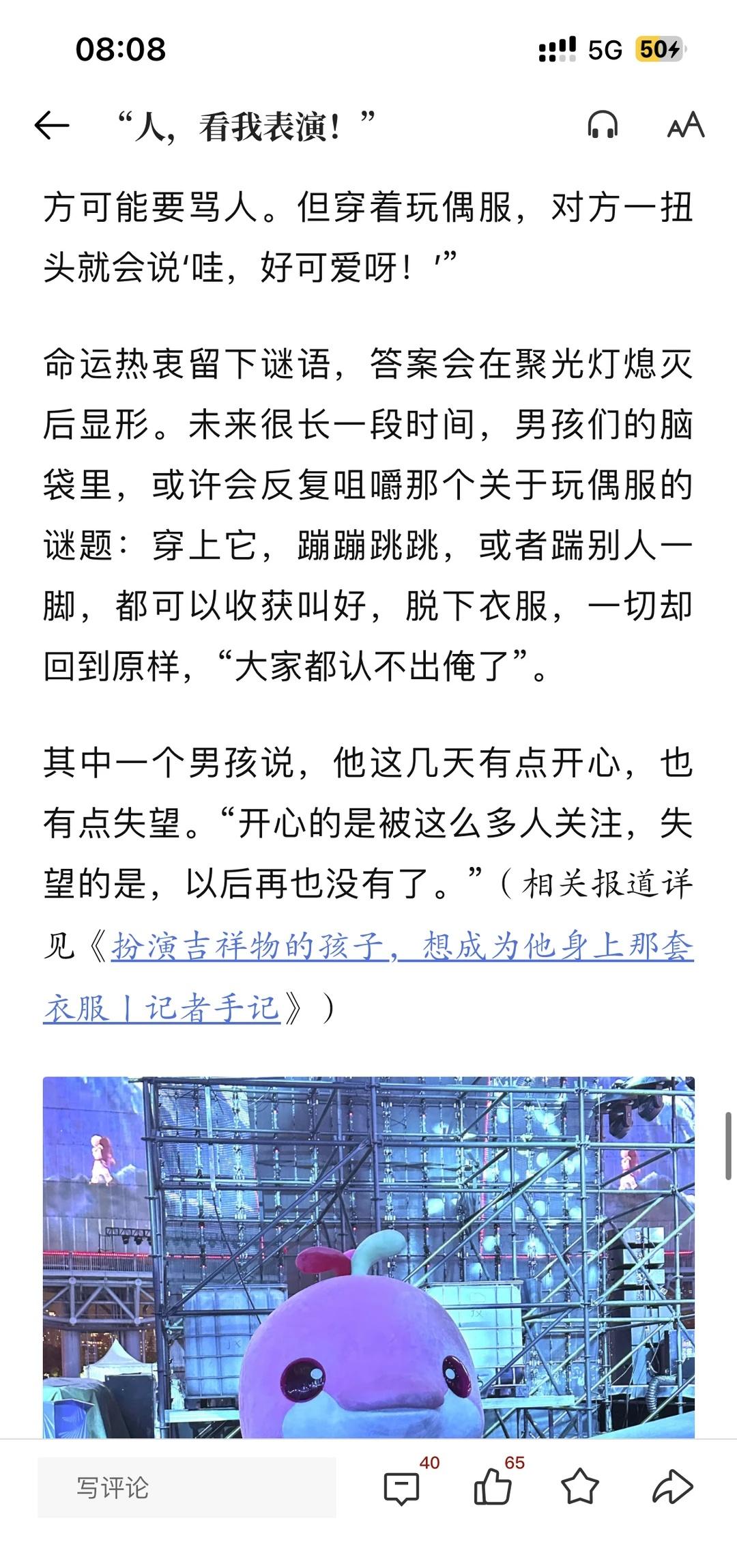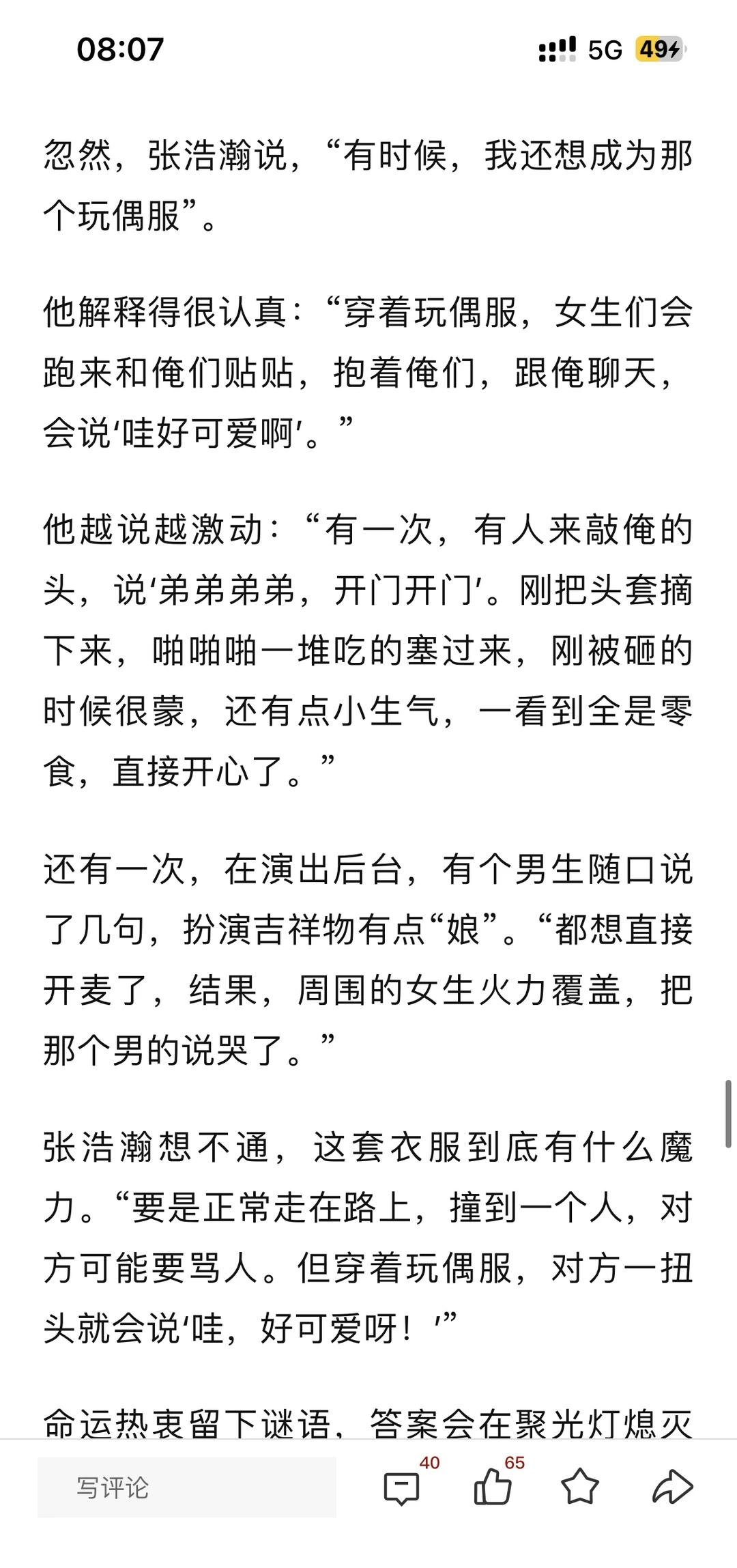 喜洋洋乐融融扮演者的故事 大湾鸡 这是大湾鸡背后扮演者的故事,采写得很细腻,看得眼角有泪。原来每个可爱动作背后都有一个故事,做出这么可爱动作的少年身上都有一段段故事。 让一个个扮演者被看到,让这个群体被看见,此刻他们不是只有“可爱”的统一皮套,是一个个鲜活的人。