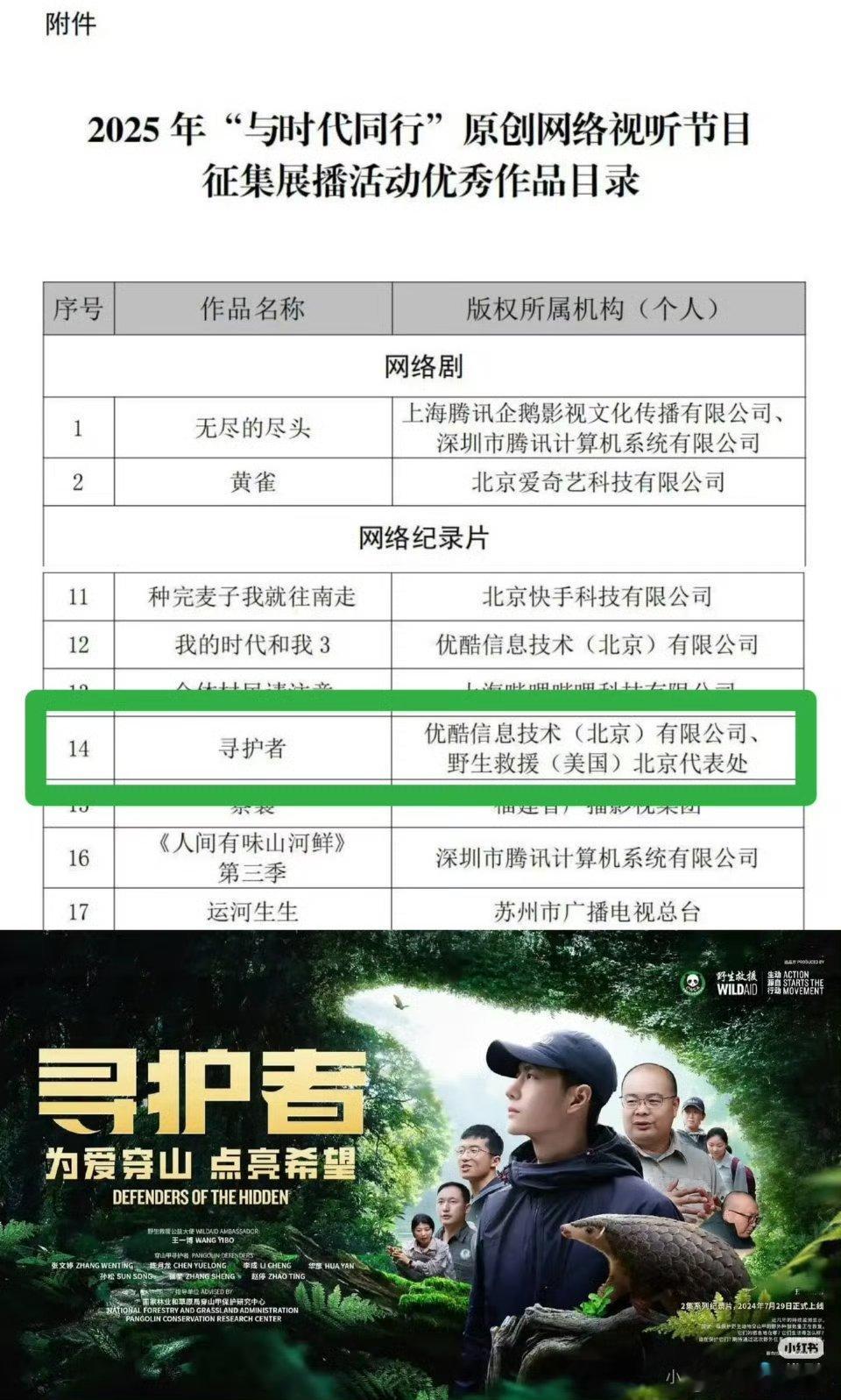 王一博野生救援纪录片项目《寻护者》成功入选2025年“与时代同行”原创网络视节目好棒的一博