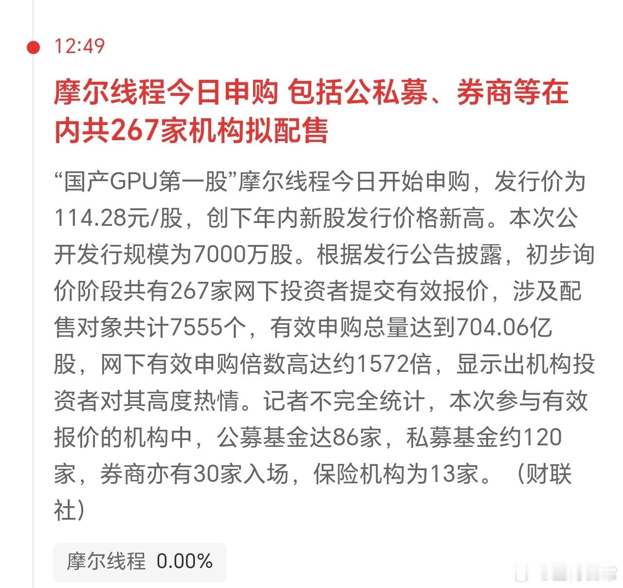 保险,券商,公募基金,私募基金,火力全开,一起申购摩尔线程。国内GPU第一股,果然是招人喜欢的很呀。